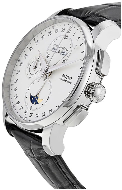 Швейцарские мужские наручные часы Mido Baroncelli 8607.4.M1.42, механический механизм (автоматический калибр) с высокой точностью. Сапфировое стеклоСапфировое стеклоПрочный и надёжный материал из кристалла сапфира синтетического происхождения, характеризующийся особой твёрдостью и устойчивостью к царапинам и повреждениям. устойчивое к появлению царапин, обладающее высокой прозрачностью. Класс водозащиты: 50 метров, позволит защитить корпус от случайных брызг или капель дождя. Корпус часов изготовлен из стали, серебристого цвета. В модели есть хронографХронографФункция позволяет измерять отрезки времени с особой точностью: часы, минуты, секунды. Верным признаком хронографа является наличие на циферблате 3 дополнительных окошек-счётчиков., 12-часовой счетчик расположен на 6 часов, 30-минутный на 12 часов и малая секунда на 9 часов. Центральная стрелка-указатель даты, апертура месяца и дня недели лаконично расположена на 12 часов, индикатор фазы луны.