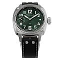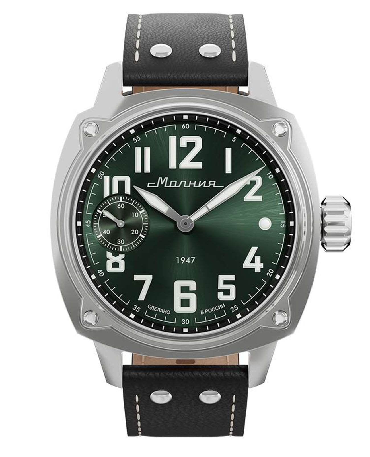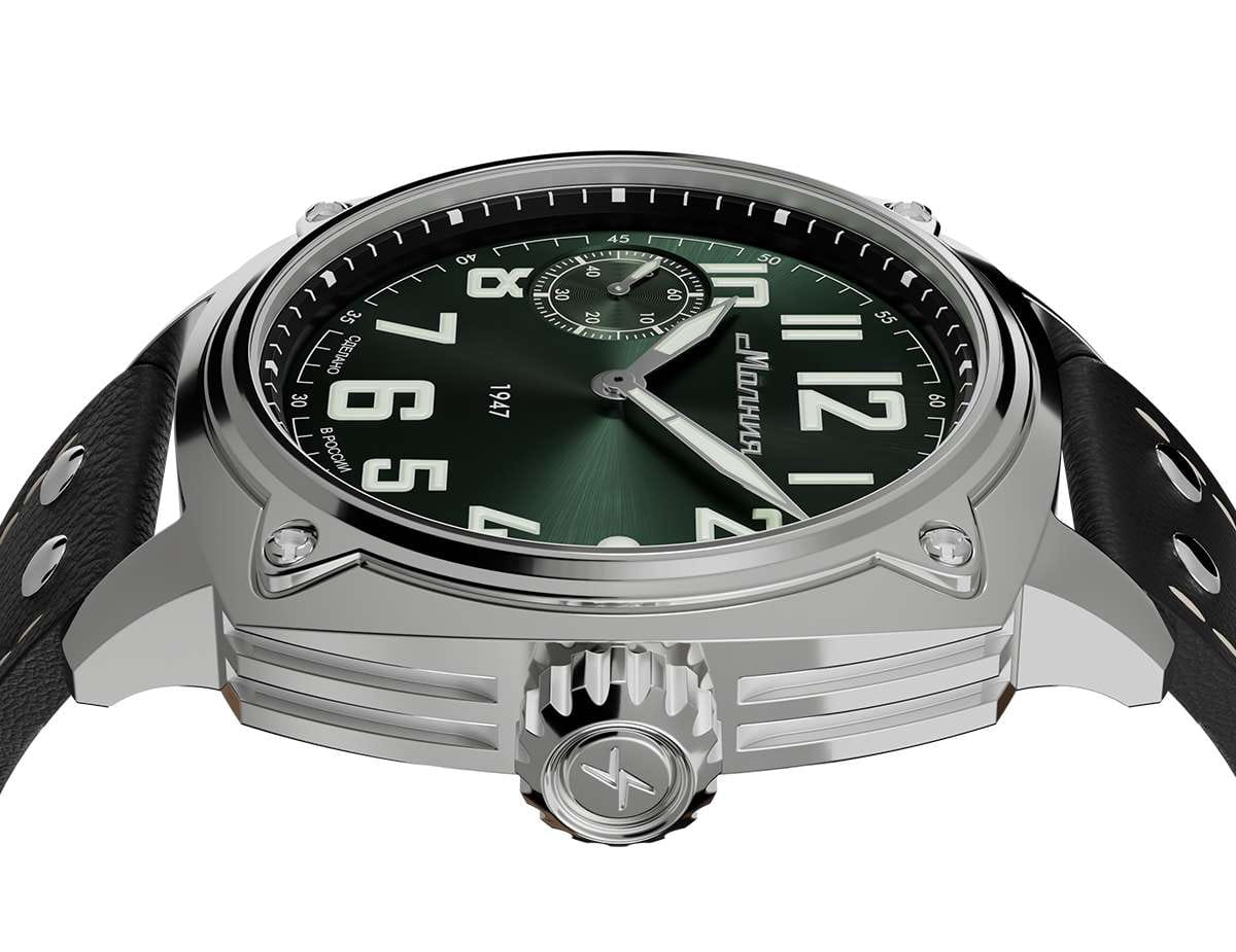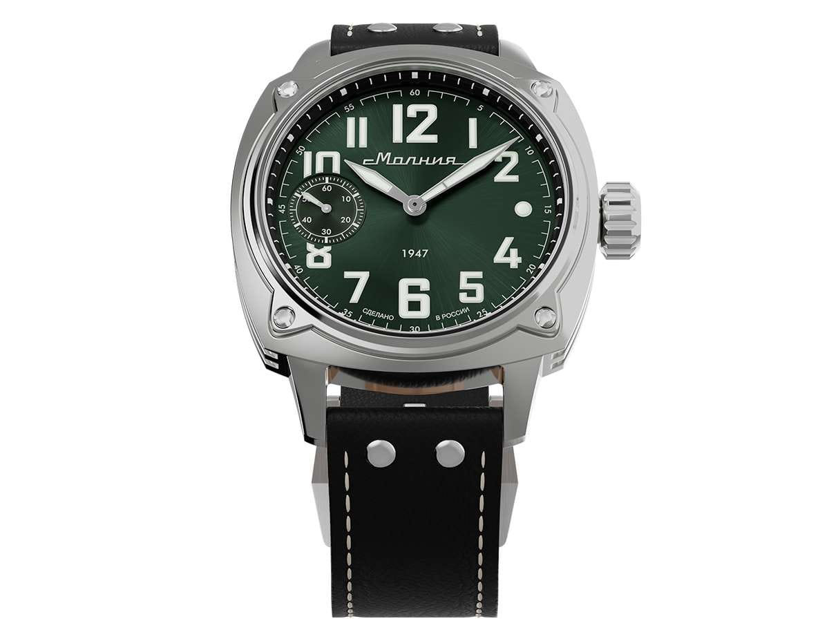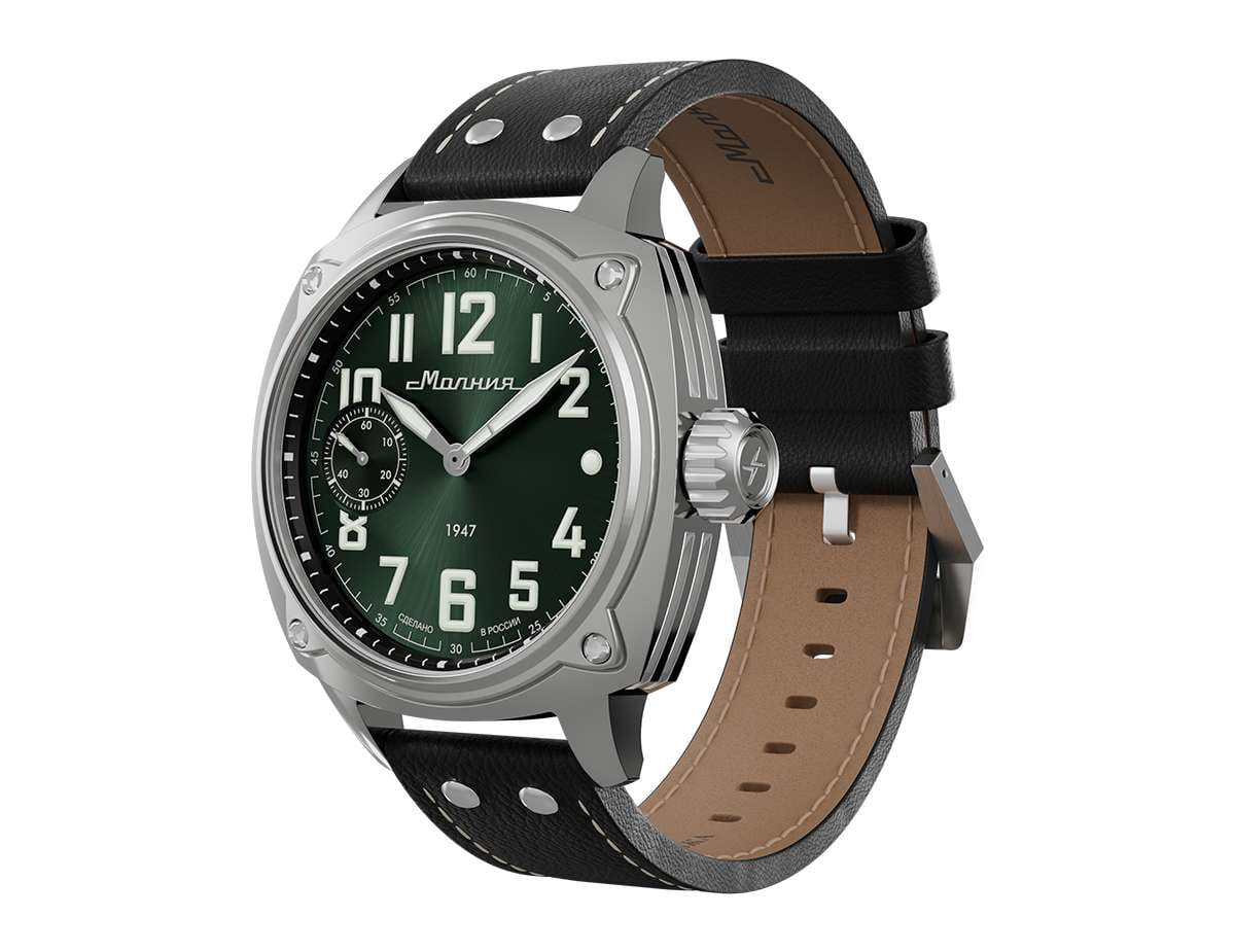 Мужские механические часы с ручным подзаводом — это аксессуар от легендарного бренда «МОЛНИЯ», созданный на Челябинском часовом заводе. Корпус диаметром 42 мм выполнен из нержавеющей стали 316L с зеркальной полировкой. БезельБезельВнешний ободок, закрепляющий стекло. В спортивных часах так называется поворотное кольцо с делениями на циферблате, выполняет роль таймера – замеряет отрезки времени на шкале. Неподвижный безель – элемент декора. Однонаправленно вращающийся безель на дайверских часах позволяет фиксировать моменты погружения и выныривания на поверхность. также выполнен из стали с зеркальной отделкой. Циферблат зелёного цвета оформлен индексами и стрелками. Малая секундная стрелка вынесена на позицию 9 часов. Стрелки и метки с люминесцентным покрытиемЛюминесцентное покрытиеПозволяет считывать показания времени в темноте. Производители наносят на стрелки, часовые индексы, безель или поверхность циферблата светонакопительный состав, дающий холодное свечение. Super-LumiNova, обеспечивающим хорошую читаемость в темноте. Циферблат защищён сапфировым стекломСапфировое стеклоПрочный и надёжный материал из кристалла сапфира синтетического происхождения, характеризующийся особой твёрдостью и устойчивостью к царапинам и повреждениям. с антибликовым покрытиемАнтибликовое покрытиеСлой оксида металла в 0,13-0,3 микрон, благодаря которому стекло часов не бликует и не отражает свет. Антибликовое покрытие уменьшает отражение света в 10 раз, обеспечивая отличную читаемость показателей циферблата.. Механизм — мануфактурный калибр 3603, собранный вручную, с запасом хода до 40 часов. Прозрачная задняя крышка позволяет наблюдать за работой механизма. Часы оснащены кожаным ремешком чёрного цвета с белой отстрочкой и классической пряжкой. Водонепроницаемость 100 м позволяет использовать часы для плавания и повседневного ношения. Идеальный выбор для тех, кто ценит российское качество и традиции.