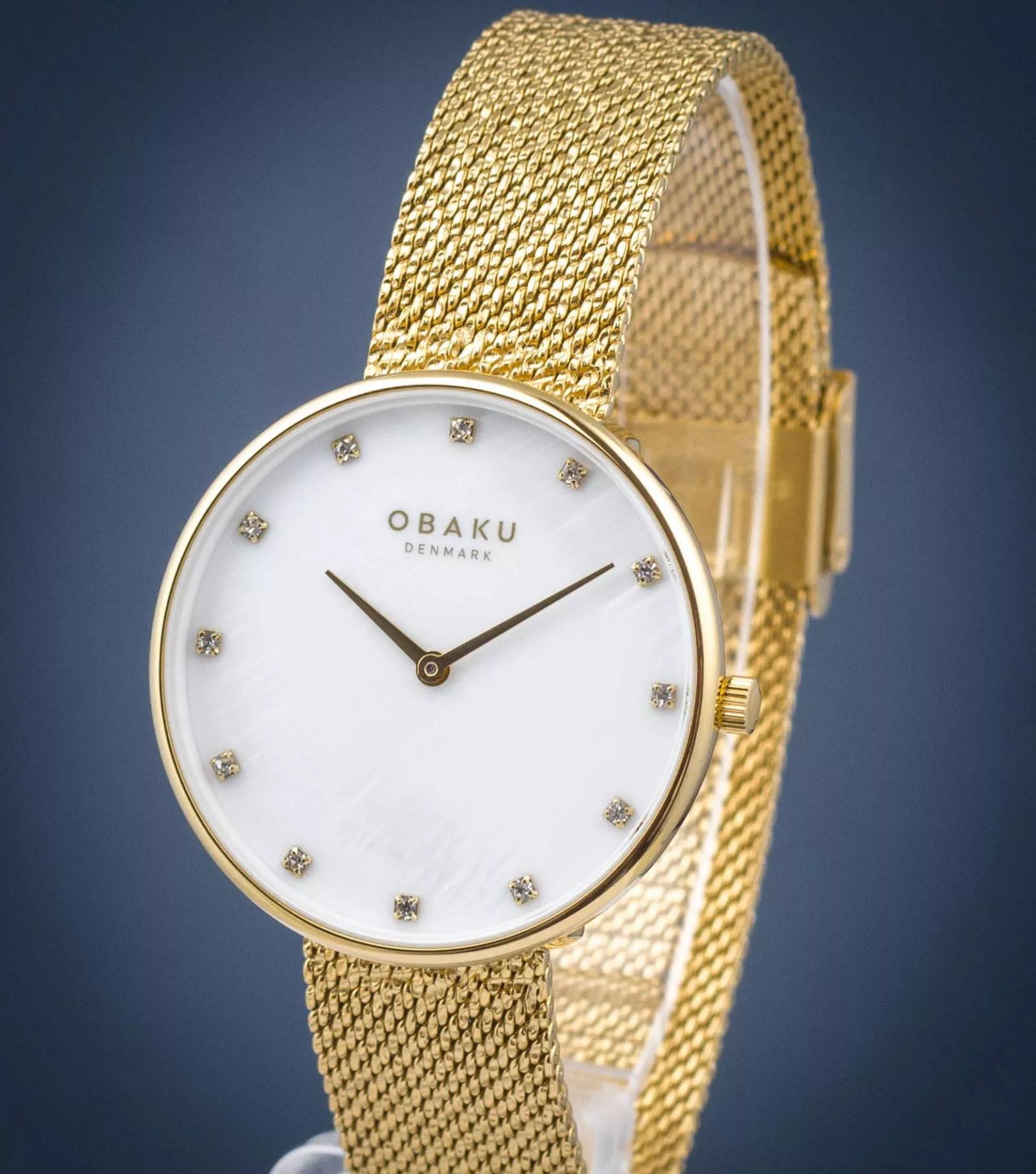 Женские наручные кварцевые часы с минеральным стекломМинеральное стеклоМинеральное стекло представляет собой искусственно выращенный минерал кварца. Такое стекло отличается особой устойчивостью к повреждениям и царапинам. Уступает по некоторым качествам сапфировому стеклу. Obaku Mesh V288LXGWHG, кварцевый механизм с высокой точностью. Класс водозащиты: 30 метров, позволит защитить корпус от случайных брызг или капель дождя. Корпус часов изготовлен из стали с IP-покрытиемIP-покрытиеМетод ионного напыления. Демонстрирует повышенную устойчивость к истиранию, окислению и химическим веществам. Под воздействием высокого давления и температуры около 1500°C молекулы металла надёжно соединяются с частицами корпуса часов.. Стальной браслет выполнен в технике миланского плетения на раскладной застёжкеРаскладная застёжкаТакой тип застёжки используется только на браслетах из металла. Она никогда не раскрывается полностью, происходит разделение на 2 и более частей. Раскладывающая застёжка снизит вероятность потери часов к минимуму. с IP-покрытиемIP-покрытиеМетод ионного напыления. Демонстрирует повышенную устойчивость к истиранию, окислению и химическим веществам. Под воздействием высокого давления и температуры около 1500°C молекулы металла надёжно соединяются с частицами корпуса часов.. Циферблат инкрустирован кристаллами.