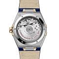 оснащена полированным безелемБезельВнешний ободок, закрепляющий стекло. В спортивных часах так называется поворотное кольцо с делениями на циферблате, выполняет роль таймера – замеряет отрезки времени на шкале. Неподвижный безель – элемент декора. Однонаправленно вращающийся безель на дайверских часах позволяет фиксировать моменты погружения и выныривания на поверхность. с 38 бриллиантами, синим циферблатом с PVDPVDУльтратонкое покрытие наносится в технике вакуумного напыления, сочетает в себе нитрид титана особой прочности со слоем золота или оксида хрома. Несёт в себе декоративную или защитную функцию.-покрытием, матовым покрытием от солнца и окошком даты в положении «6 часов». Стрелки, логотип OMEGA, звезда Созвездия и индексы выполнены из желтого золота 18 карат18-каратное золотоОбозначение по каратной системе пробирования, оно показывает, сколько драгоценного металла содержится в изделии. 18 карат - в составе 75% чистого золота, соответствует 750 пробе.