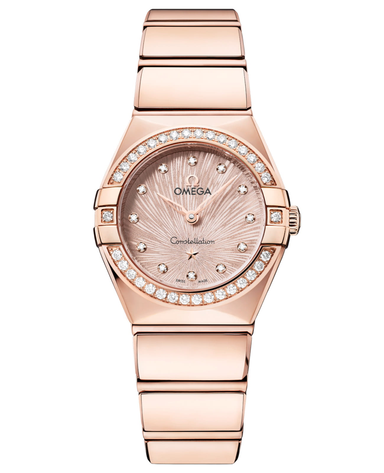 Легендарные часы OMEGA Constellation воплощают космическую гармонию в своем узнаваемом корпусе с плавными полукруглыми гранями и зеркальными скобами, напоминающими последние лучи заходящего солнца. Эта изысканная 25-миллиметровая модель из 18-каратного золота18-каратное золотоОбозначение по каратной системе пробирования, оно показывает, сколько драгоценного металла содержится в изделии. 18 карат - в составе 75% чистого золота, соответствует 750 пробе.