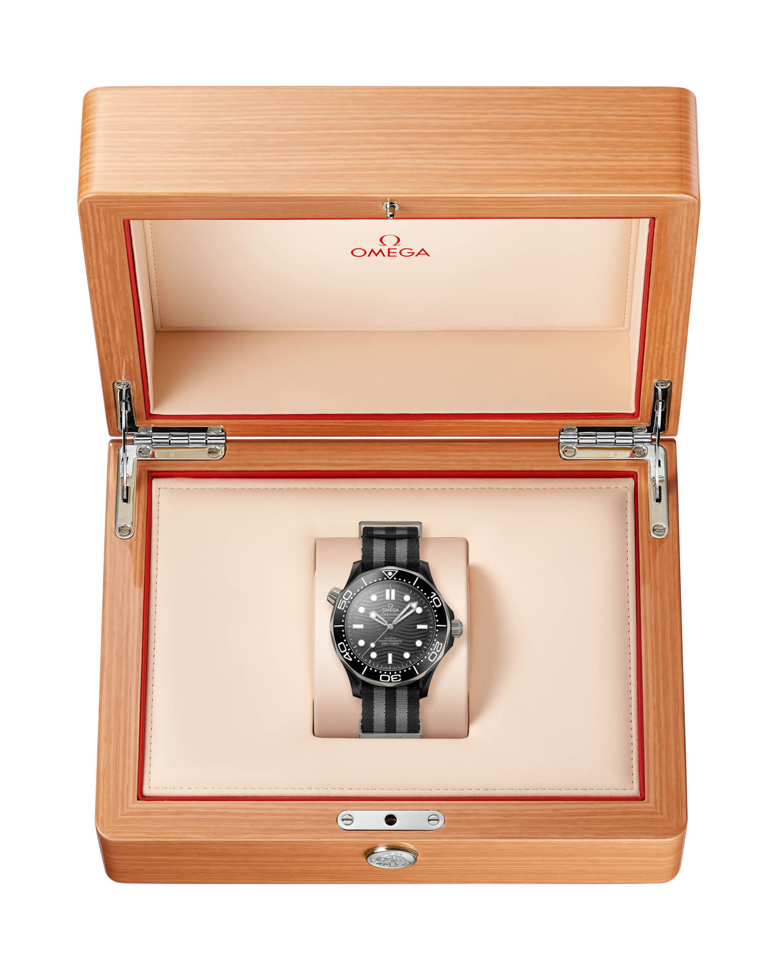 Часы Seamaster Professional Diver 300M, появившиеся на свет в 1993 году, привлекли внимание огромного количества ценителей часового искусства. Нынешняя коллекция вобрала в себя знаменитое океанское наследие, привнеся в него лучшие инновации и дизайнерские решения OMEGA. Эта модель диаметром 43,5 мм в корпусе из черной керамики и титана Grade 5 имеет черный керамический безельБезельВнешний ободок, закрепляющий стекло. В спортивных часах так называется поворотное кольцо с делениями на циферблате, выполняет роль таймера – замеряет отрезки времени на шкале. Неподвижный безель – элемент декора. Однонаправленно вращающийся безель на дайверских часах позволяет фиксировать моменты погружения и выныривания на поверхность. с дайверской шкалой из белой эмали. На циферблате из матовой черной керамики [ZrO2] лазером выгравирован волнообразный узор. Скелетонизированные стрелки и выпуклые индексы с титановым PVD-покрытиемPVDУльтратонкое покрытие наносится в технике вакуумного напыления, сочетает в себе нитрид титана особой прочности со слоем золота или оксида хрома. Несёт в себе декоративную или защитную функцию. имеют углубления, заполненные белым люминесцентным составом Super-LumiNovaЛюминесцентное покрытиеПозволяет считывать показания времени в темноте. Производители наносят на стрелки, часовые индексы, безель или поверхность циферблата светонакопительный состав, дающий холодное свечение., а гелиевому клапану придана коническая форма. Часы дополнены ремешком NATOРемешок NATOРемешок NATO — это прочный, универсальный и сменный часовой ремешок, изначально созданный для военных. Он изготовлен из нейлона или другого прочного материала и имеет уникальную конструкцию, которая позволяет часам оставаться на запястье даже в случае поломки одной из прикрепляющих точек. с 5 полосками черного и серого цветов с матовой застежкой и титановой шлевкой оснащены калибром OMEGA Master Chronometer 8806, который виден сквозь сапфировое стеклоСапфировое стеклоПрочный и надёжный материал из кристалла сапфира синтетического происхождения, характеризующийся особой твёрдостью и устойчивостью к царапинам и повреждениям. задней крышки с волнистым краем.