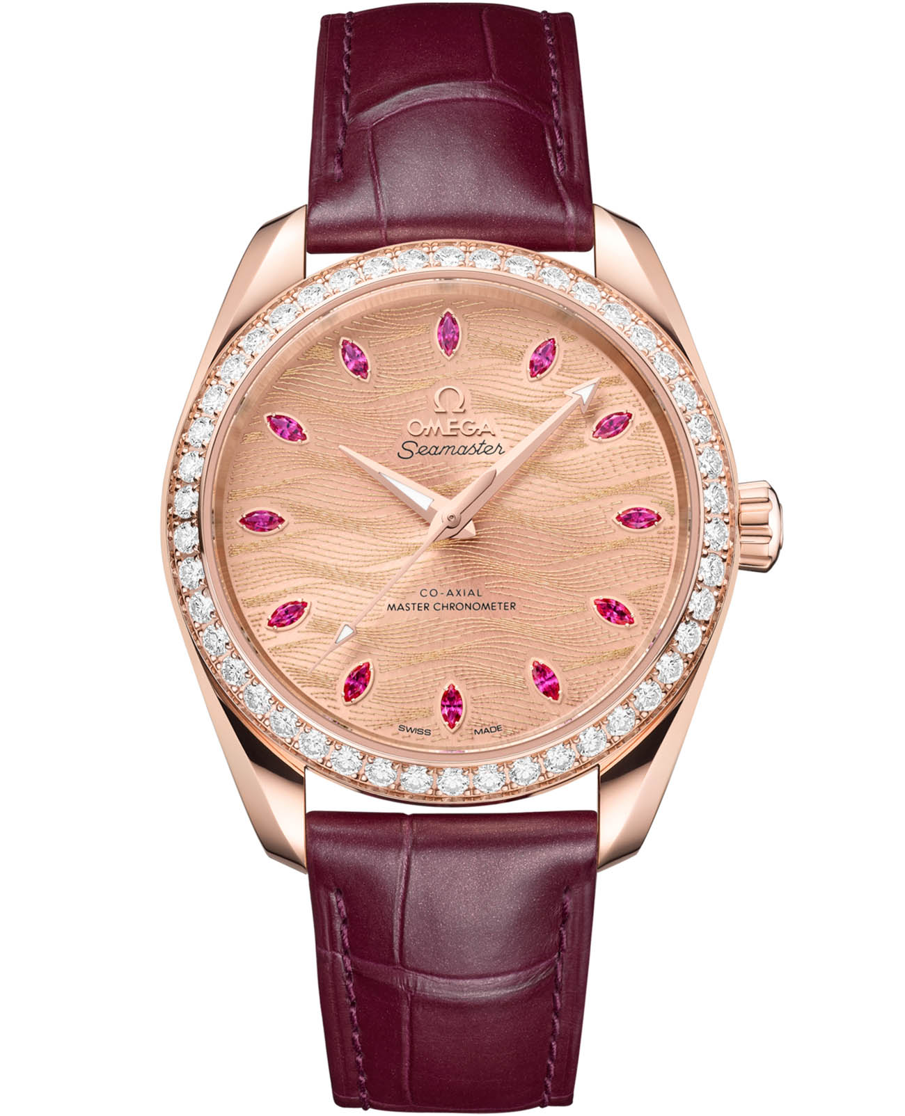Omega Seamaster Aqua Terra выполнены в симметричном корпусе из 18K Sedna™ золота с завинчивающейся задней крышкой, украшенной волновым узором. Безель инкрустирован бриллиантами, что добавляет модели роскошный акцент. Циферблат дополнен окошком даты и оформлен уникальным волновым рисунком, созданным методом wire bonding — технологией, используемой в микроэлектронике. Циферблат имеет основу из 18K золота и покрыт PVD для стойкости цвета. Часовые метки представлены рубинами, а стрелки выполнены из 18K Sedna™ золота и оснащены люминесцентным покрытиемЛюминесцентное покрытиеПозволяет считывать показания времени в темноте. Производители наносят на стрелки, часовые индексы, безель или поверхность циферблата светонакопительный состав, дающий холодное свечение. Super-LumiNova для лучшей читаемости в темноте. Калибр Omega 8807 сертифицирован как Master Chronometer — гарантия высочайшей точности и устойчивости к магнитным полям. Запас хода составляет 55 часов. Защиту циферблата обеспечивает сапфировое стеклоСапфировое стеклоПрочный и надёжный материал из кристалла сапфира синтетического происхождения, характеризующийся особой твёрдостью и устойчивостью к царапинам и повреждениям. с антибликовым покрытиемАнтибликовое покрытиеСлой оксида металла в 0,13-0,3 микрон, благодаря которому стекло часов не бликует и не отражает свет. Антибликовое покрытие уменьшает отражение света в 10 раз, обеспечивая отличную читаемость показателей циферблата. с обеих сторон. Водозащита позволяет использовать часы в воде без риска повреждения. Часы установлены на красный кожаный ремешок. Это сочетание премиального качества, технологичности и классического дизайна.