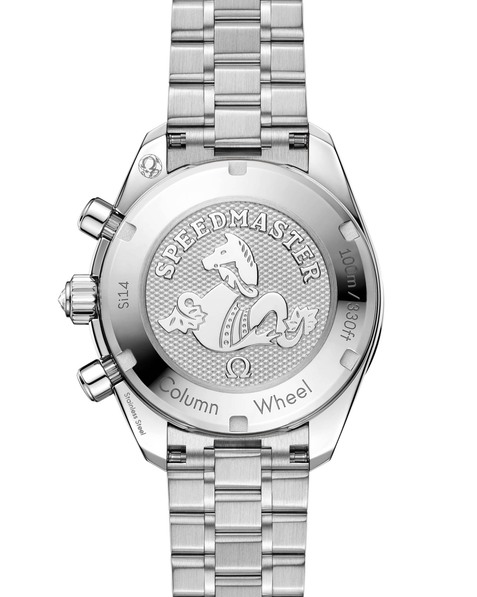 Speedmaster 38 мм переосмысливает культовый хронограф OMEGA, сохраняя его особенности в изысканном компактном формате. Полированный корпус из нержавеющей стали сияет в обрамлении безеляБезельВнешний ободок, закрепляющий стекло. В спортивных часах так называется поворотное кольцо с делениями на циферблате, выполняет роль таймера – замеряет отрезки времени на шкале. Неподвижный безель – элемент декора. Однонаправленно вращающийся безель на дайверских часах позволяет фиксировать моменты погружения и выныривания на поверхность. с 52 бриллиантами, а заводную головку венчает еще один сверкающий камень. Коричневый циферблат с PVD-покрытиемPVDУльтратонкое покрытие наносится в технике вакуумного напыления, сочетает в себе нитрид титана особой прочности со слоем золота или оксида хрома. Несёт в себе декоративную или защитную функцию. играет переливами, демонстрируя горизонтальные овальные счетчики с серебристым покрытием и вертикальное окошко даты на 6 часах. Стрелки с алмазной полировкойЛюминесцентное покрытиеПозволяет считывать показания времени в темноте. Производители наносят на стрелки, часовые индексы, безель или поверхность циферблата светонакопительный состав, дающий холодное свечение., покрытые Super-LumiNova, мерцают изумрудным светом в темноте. Браслет из нержавеющей стали с чередующейся полировкой и матовыми поверхностями оснащен фирменной системой регулировки OMEGA. На завинчивающейся задней крышке красуется медальон с морским коньком, а сердцем модели служит точный калибр OMEGA Co-Axial 3330 - современная интерпретация легендарного механизма.