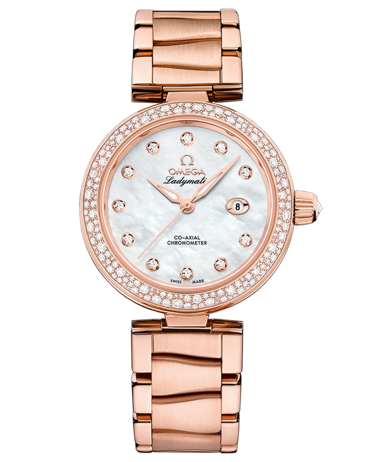 сияют благородным теплым блеском, как и стрелки формы "альфа" с 11 бриллиантовыми индексами. Белоснежный жемчужно-перламутровый циферблат обрамлен безелемБезельВнешний ободок, закрепляющий стекло. В спортивных часах так называется поворотное кольцо с делениями на циферблате, выполняет роль таймера – замеряет отрезки времени на шкале. Неподвижный безель – элемент декора. Однонаправленно вращающийся безель на дайверских часах позволяет фиксировать моменты погружения и выныривания на поверхность. с россыпью бриллиантов разных размеров, а заводная головка украшена уникальным бриллиантом огранки "Brilliant OMEGA Cut". Практичное окошко даты на "3 часах" гармонично дополняет композицию, а в сердце часов скрыт инновационный коаксиальный механизм OMEGA калибра 8521 в титановой защитной оболочке — идеальное сочетание роскоши и высоких технологий.