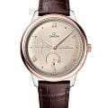 270-градусный индикатор запаса хода расположен в положении "6 часов". Он имеет двухслойную конструкцию в форме полумесяца, состоящую из нижней пластины с изящной контрастной отделкой, выполненной в одной цветовой гамме, и верхней пластины с 4-я секторальными прорезями. Изделие с лаконичным дизайном дополнено окошком указателя даты в положении «6 часов», счетчиком малой секундной стрелки в положении «9 часов» и минутной шкалой в стиле «железная дорога» на внешнем секторе. Часы с сертификатом Master Chronometer представлены с кожаным ремешком коричневого цвета. Модель оснащена калибром OMEGA Master Co-Axial 8810, который виден сквозь устойчивое к царапинам сапфировое стеклоСапфировое стеклоПрочный и надёжный материал из кристалла сапфира синтетического происхождения, характеризующийся особой твёрдостью и устойчивостью к царапинам и повреждениям. задней крышки корпуса.