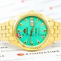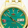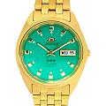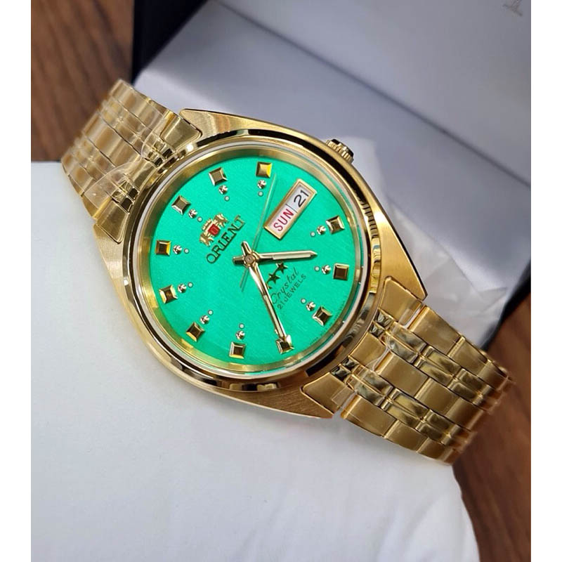 Модель Orient AB00001N из серии Three Stars — это классические японские автоматические часы, сочетающие надёжность и винтажную эстетику. Корпус диаметром 37 мм и браслет выполнены из нержавеющей стали с полированным золотистым покрытием. Зелёный циферблат с солнечной шлифовкой дополнен стрелками и метками, покрытыми люминесцентным покрытиемЛюминесцентное покрытиеПозволяет считывать показания времени в темноте. Производители наносят на стрелки, часовые индексы, безель или поверхность циферблата светонакопительный состав, дающий холодное свечение., обеспечивая отличную читаемость в любых условиях.