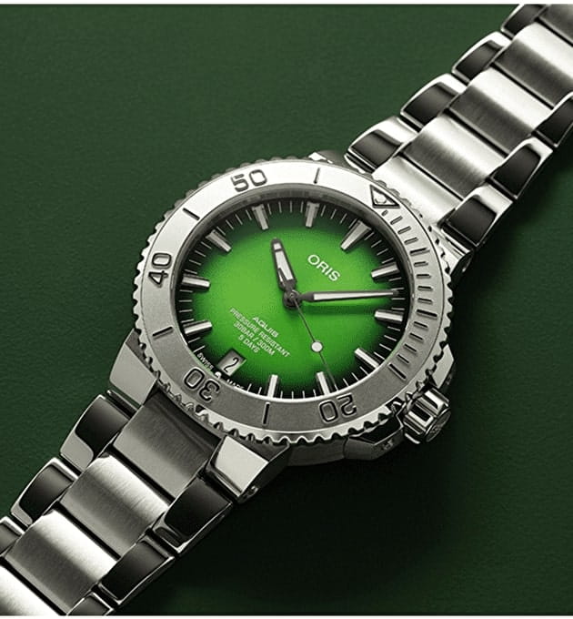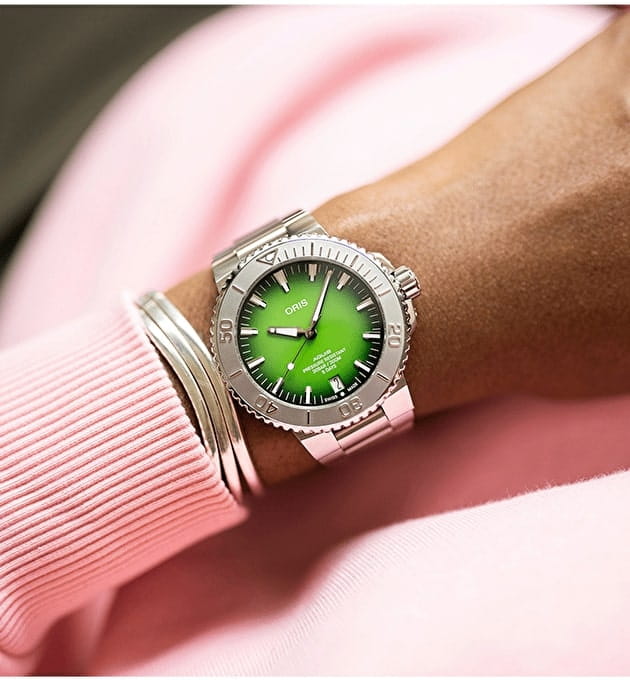 Ограниченная серия Payoon создана на базе Oris Aquis Date Calibre 400 и выпущена ограниченной серией из 250 экземпляров. Она имеет зеленый циферблат, напоминающий цвет воды острова Ко Либонг, серый рельефный безель, напоминающий цвет кожи дюгоней, и гравировку с изображением дюгоня и его детеныша на задней крышке.