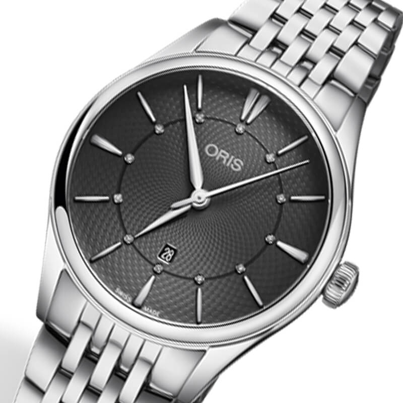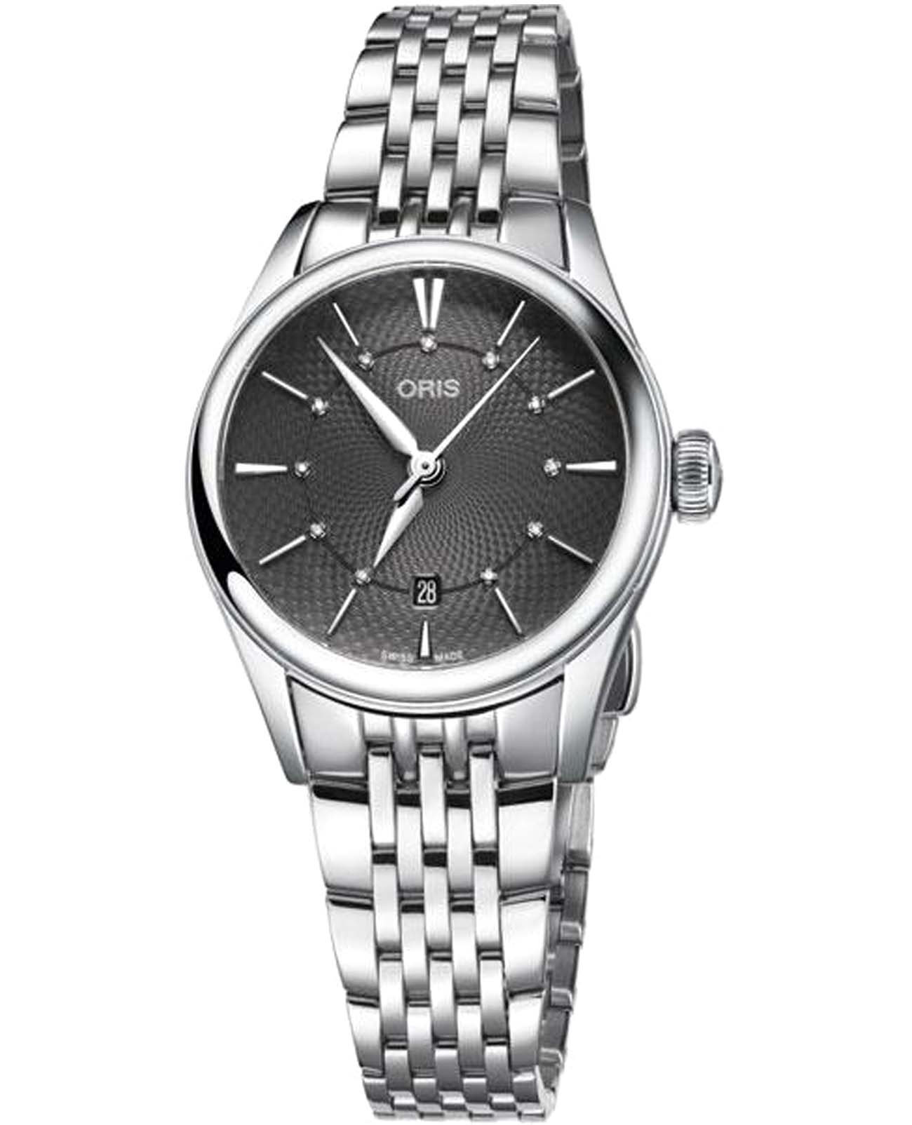Oris 01 561 7722 4053-07 8 14 79 Artelier – это элегантные часы, сочетающие в себе классический дизайн и современную функциональность. Корпус из нержавеющей стали диаметром 28 мм идеально подходит для тех, кто ценит утонченность и стиль. Сапфировое стеклоСапфировое стеклоПрочный и надёжный материал из кристалла сапфира синтетического происхождения, характеризующийся особой твёрдостью и устойчивостью к царапинам и повреждениям. с антибликовым покрытием защищает циферблат от царапин и обеспечивает отличную читаемость при любом освещении. Стальной браслет на застёжке-бабочке с кнопкамиЗастёжка "бабочка"Такой вид застёжки дополняется предохранителями, помогающими избежать случайного раскрытия браслета. Обладают изящным исполнением. идеально дополняет дизайн часов, обеспечивая комфортное ношение. Часы оснащены центральной секундной стрелкой и окошком даты в положении «6 часов», что делает их функциональными для повседневного использования. Часы обладают водонепроницаемостью в 5 бар (50 метров). Каждая из этих функций прекрасно отображается на потрясающем циферблате, украшенном накладными индексами, гладкими стрелками из нержавеющей стали с бриллиантами 0,0152 карата, установленными в маркерах, и легендарным логотипом Oris.