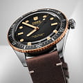 Многокомпонентный корпус из бронзы и стали, вращающийся безельБезельВнешний ободок, закрепляющий стекло. В спортивных часах так называется поворотное кольцо с делениями на циферблате, выполняет роль таймера – замеряет отрезки времени на шкале. Неподвижный безель – элемент декора. Однонаправленно вращающийся безель на дайверских часах позволяет фиксировать моменты погружения и выныривания на поверхность. с минутной шкалой . Сапфировое стеклоСапфировое стеклоПрочный и надёжный материал из кристалла сапфира синтетического происхождения, характеризующийся особой твёрдостью и устойчивостью к царапинам и повреждениям., выпуклое с обеих сторон, внутреннее антибликовое покрытие. Прозрачная задняя крышка из сапфирового стеклаСапфировое стеклоПрочный и надёжный материал из кристалла сапфира синтетического происхождения, характеризующийся особой твёрдостью и устойчивостью к царапинам и повреждениям.. Стрелки и метки с люминесцентным покрытиемЛюминесцентное покрытиеПозволяет считывать показания времени в темноте. Производители наносят на стрелки, часовые индексы, безель или поверхность циферблата светонакопительный состав, дающий холодное свечение.. Завинчивающаяся заводная головка.