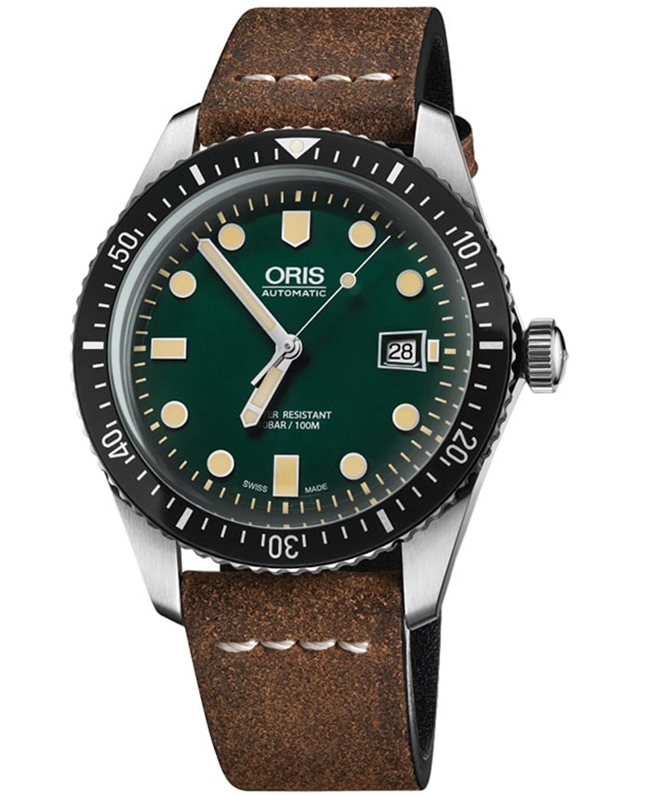 Швейцарские мужские часы ORIS Divers Sixty-Five. Корпус выполнен из высококачественной нержавеющей стали, что обеспечивает прочность и долговечность. Циферблат с традиционными стрелками и метками в виде штрихов защищен устойчивым к царапинам сапфировым стеклом с антибликовым покрытиемСапфировое стеклоПрочный и надёжный материал из кристалла сапфира синтетического происхождения, характеризующийся особой твёрдостью и устойчивостью к царапинам и повреждениям., обеспечивающим отличную читаемость показаний в любых условиях. Механизм Oris 733 — это автоматический механизм с автоподзаводом, который гарантирует точность хода и надежность работы. Функционал включает центральные часовые, минутные и секундные стрелки, окошко даты с быстрым переводом, а также функцию stop-second для точной настройки времени. Запас хода механизма составляет 41 час. Стрелки и метки имеют люминесцентное покрытиеЛюминесцентное покрытиеПозволяет считывать показания времени в темноте. Производители наносят на стрелки, часовые индексы, безель или поверхность циферблата светонакопительный состав, дающий холодное свечение., которое позволяет легко определять время даже в темноте. Поворотный безель из нержавеющей стали с PVD-покрытиемPVDУльтратонкое покрытие наносится в технике вакуумного напыления, сочетает в себе нитрид титана особой прочности со слоем золота или оксида хрома. Несёт в себе декоративную или защитную функцию. помогает точно отслеживать промежутки времени. Водозащита до 100 метров (WR100) делает эти часы идеальными для плавания и других водных видов спорта. Кожаный ремешок на стандартной застёжке.