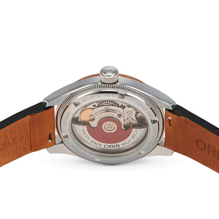Многокомпонентный стальной корпус; бронзовый ободок. Сапфировое стеклоСапфировое стеклоПрочный и надёжный материал из кристалла сапфира синтетического происхождения, характеризующийся особой твёрдостью и устойчивостью к царапинам и повреждениям., выпуклое с обеих сторон, внутреннее антибликовое покрытие. Нержавеющая сталь, завинчивающаяся прозрачная задняя крышка из минерального стеклаМинеральное стеклоМинеральное стекло представляет собой искусственно выращенный минерал кварца. Такое стекло отличается особой устойчивостью к повреждениям и царапинам. Уступает по некоторым качествам сапфировому стеклу.. Стрелки с люминесцентным покрытиемЛюминесцентное покрытиеПозволяет считывать показания времени в темноте. Производители наносят на стрелки, часовые индексы, безель или поверхность циферблата светонакопительный состав, дающий холодное свечение.. Кожаный ремень.