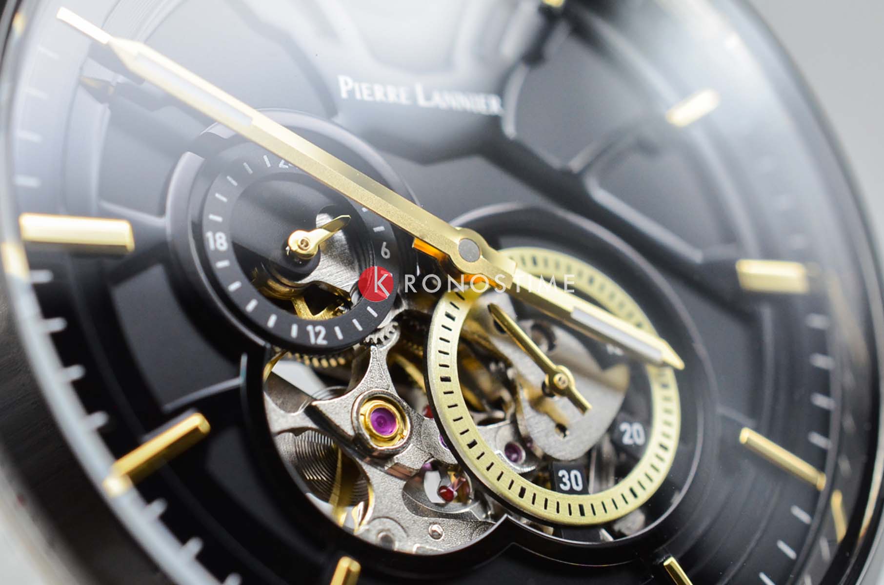 Мужские механические часы с автоподзаводом Pierre Lannier Trio 331H131. Минеральное стеклоМинеральное стеклоМинеральное стекло представляет собой искусственно выращенный минерал кварца. Такое стекло отличается особой устойчивостью к повреждениям и царапинам. Уступает по некоторым качествам сапфировому стеклу. устойчивое к мелким механическим повреждениям. Центральные часовая и минутная стрелки, секундная стрелка вынесена в малый циферблат. 12/24х часовой формат времени. Черный скелетонизированный циферблат. Корпус выполнен из нержавеющей стали с IP-покрытиемIP-покрытиеМетод ионного напыления. Демонстрирует повышенную устойчивость к истиранию, окислению и химическим веществам. Под воздействием высокого давления и температуры около 1500°C молекулы металла надёжно соединяются с частицами корпуса часов.. Водостойкость: 50 метров, позволит защитить корпус от случайных брызг или капель дождя. Стальной браслет на раскладной застёжкеРаскладная застёжкаТакой тип застёжки используется только на браслетах из металла. Она никогда не раскрывается полностью, происходит разделение на 2 и более частей. Раскладывающая застёжка снизит вероятность потери часов к минимуму.. Стрелки с люминесцентным покрытиемЛюминесцентное покрытиеПозволяет считывать показания времени в темноте. Производители наносят на стрелки, часовые индексы, безель или поверхность циферблата светонакопительный состав, дающий холодное свечение.. Диаметр корпуса составляет 42 мм, толщина 13,55 мм.