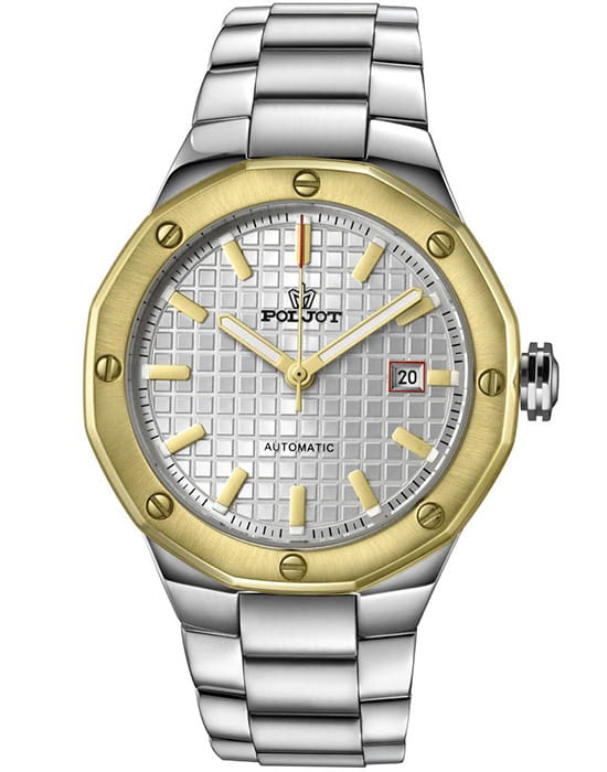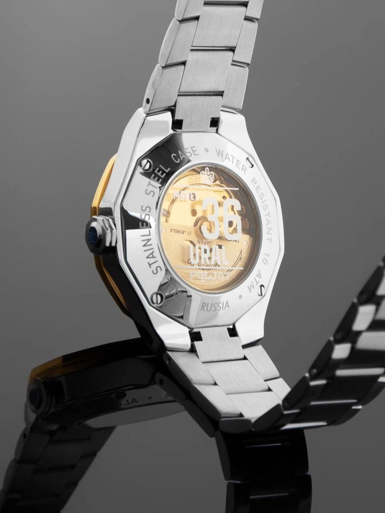 Poljot Ural 8215.365244Б — стильные механические часы с автоподзаводом, сочетающие брутальный характер и современную элегантность. Корпус выполнен из нержавеющей стали, что придаёт модели монолитность и прочность, а глубокий циферблат подчеркивает премиальный облик. Стальной браслет на застёжке-бабочке с кнопкамиЗастёжка "бабочка"Такой вид застёжки дополняется предохранителями, помогающими избежать случайного раскрытия браслета. Обладают изящным исполнением. . БезельБезельВнешний ободок, закрепляющий стекло. В спортивных часах так называется поворотное кольцо с делениями на циферблате, выполняет роль таймера – замеряет отрезки времени на шкале. Неподвижный безель – элемент декора. Однонаправленно вращающийся безель на дайверских часах позволяет фиксировать моменты погружения и выныривания на поверхность. с PVD-покрытиемPVDУльтратонкое покрытие наносится в технике вакуумного напыления, сочетает в себе нитрид титана особой прочности со слоем золота или оксида хрома. Несёт в себе декоративную или защитную функцию.. Внутри установлен надёжный японский механизм Miyota 8215, обеспечивающий точный ход и плавную работу стрелок. Широкие метки и стрелки с люминесцентным покрытиемЛюминесцентное покрытиеПозволяет считывать показания времени в темноте. Производители наносят на стрелки, часовые индексы, безель или поверхность циферблата светонакопительный состав, дающий холодное свечение. гарантируют превосходную читаемость в любое время суток, а окно даты добавляет удобства. Прочное минеральное стеклоМинеральное стеклоМинеральное стекло представляет собой искусственно выращенный минерал кварца. Такое стекло отличается особой устойчивостью к повреждениям и царапинам. Уступает по некоторым качествам сапфировому стеклу. защищает циферблат от повреждений, а водонепроницаемость до 10 бар делает часы надёжным спутником как в деловом, так и активном образе жизни. Poljot Ural — воплощение силы, точности и мужского стиля, созданное для тех, кто ценит механику и уверенность в каждой детали.