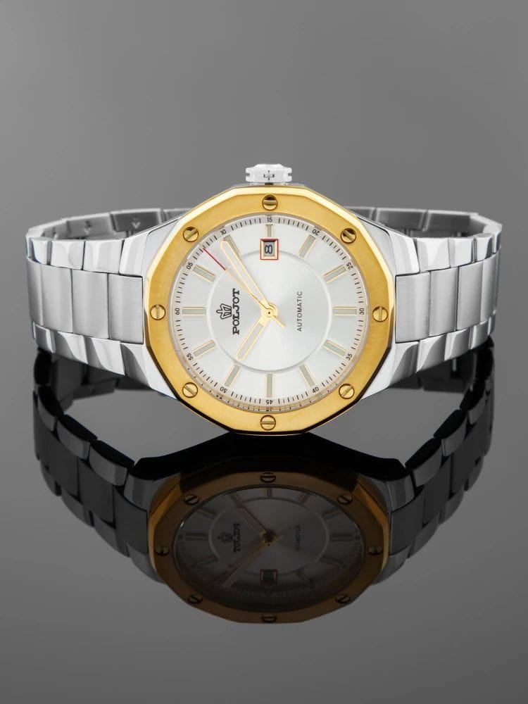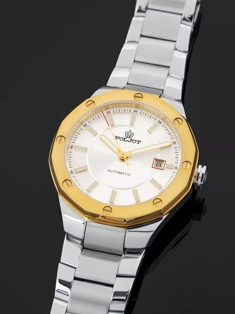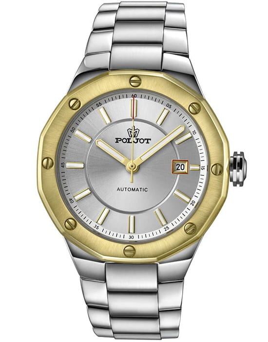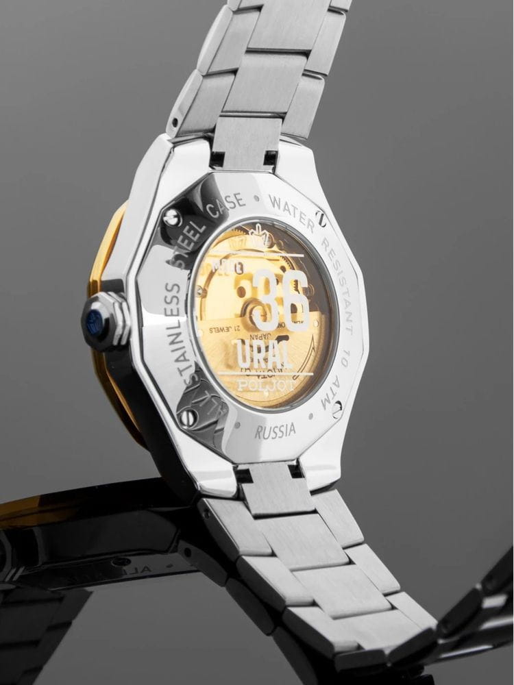 Poljot Ural 8215.365248Б — стильные механические часы с автоподзаводом, сочетающие брутальный характер и современную элегантность. Корпус выполнен из нержавеющей стали, что придаёт модели монолитность и прочность, а глубокий циферблат подчеркивает премиальный облик. Стальной браслет на застёжке-бабочке с кнопкамиЗастёжка "бабочка"Такой вид застёжки дополняется предохранителями, помогающими избежать случайного раскрытия браслета. Обладают изящным исполнением. . БезельБезельВнешний ободок, закрепляющий стекло. В спортивных часах так называется поворотное кольцо с делениями на циферблате, выполняет роль таймера – замеряет отрезки времени на шкале. Неподвижный безель – элемент декора. Однонаправленно вращающийся безель на дайверских часах позволяет фиксировать моменты погружения и выныривания на поверхность. с PVD-покрытиемPVDУльтратонкое покрытие наносится в технике вакуумного напыления, сочетает в себе нитрид титана особой прочности со слоем золота или оксида хрома. Несёт в себе декоративную или защитную функцию.. Внутри установлен надёжный японский механизм Miyota 8215, обеспечивающий точный ход и плавную работу стрелок. Широкие метки и стрелки с люминесцентным покрытиемЛюминесцентное покрытиеПозволяет считывать показания времени в темноте. Производители наносят на стрелки, часовые индексы, безель или поверхность циферблата светонакопительный состав, дающий холодное свечение. гарантируют превосходную читаемость в любое время суток, а окно даты добавляет удобства. Прочное минеральное стеклоМинеральное стеклоМинеральное стекло представляет собой искусственно выращенный минерал кварца. Такое стекло отличается особой устойчивостью к повреждениям и царапинам. Уступает по некоторым качествам сапфировому стеклу. защищает циферблат от повреждений, а водонепроницаемость до 10 бар делает часы надёжным спутником как в деловом, так и активном образе жизни. Poljot Ural — воплощение силы, точности и мужского стиля, созданное для тех, кто ценит механику и уверенность в каждой детали.