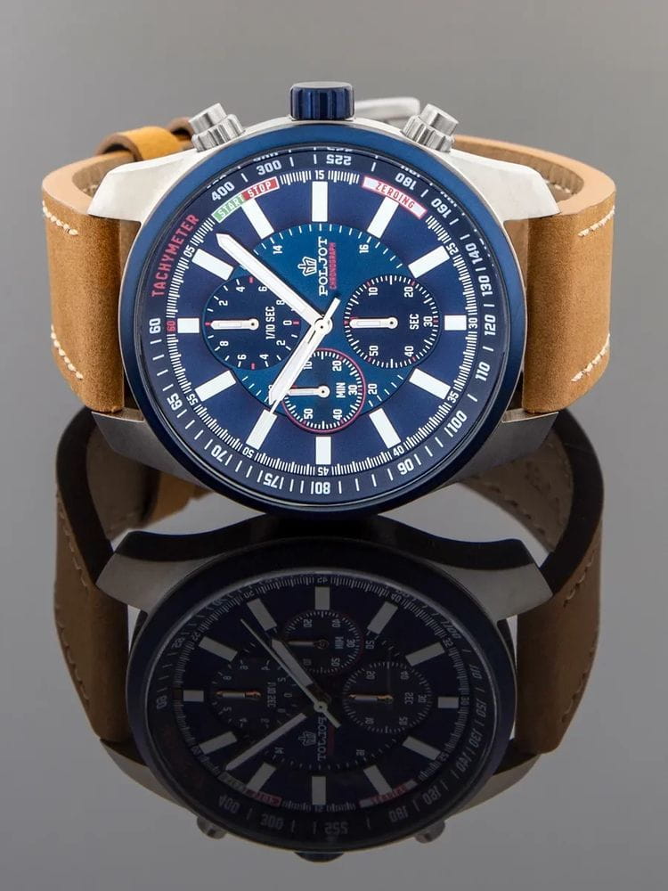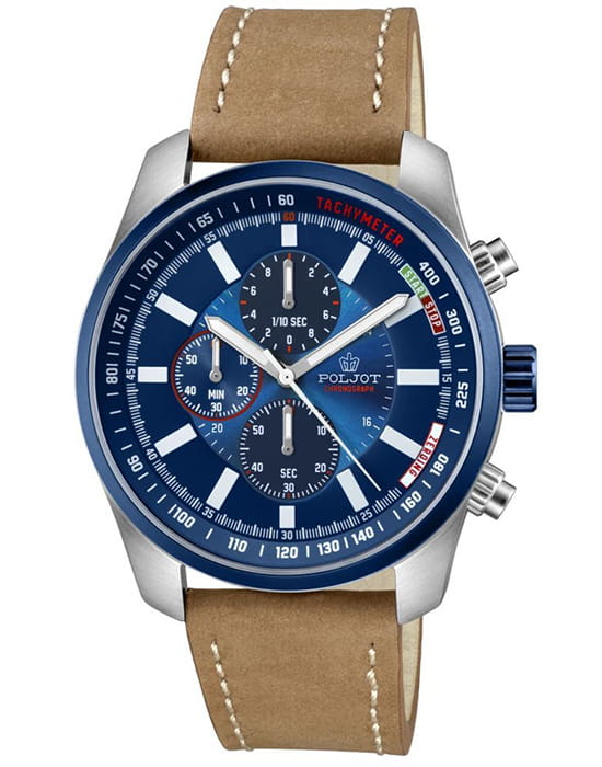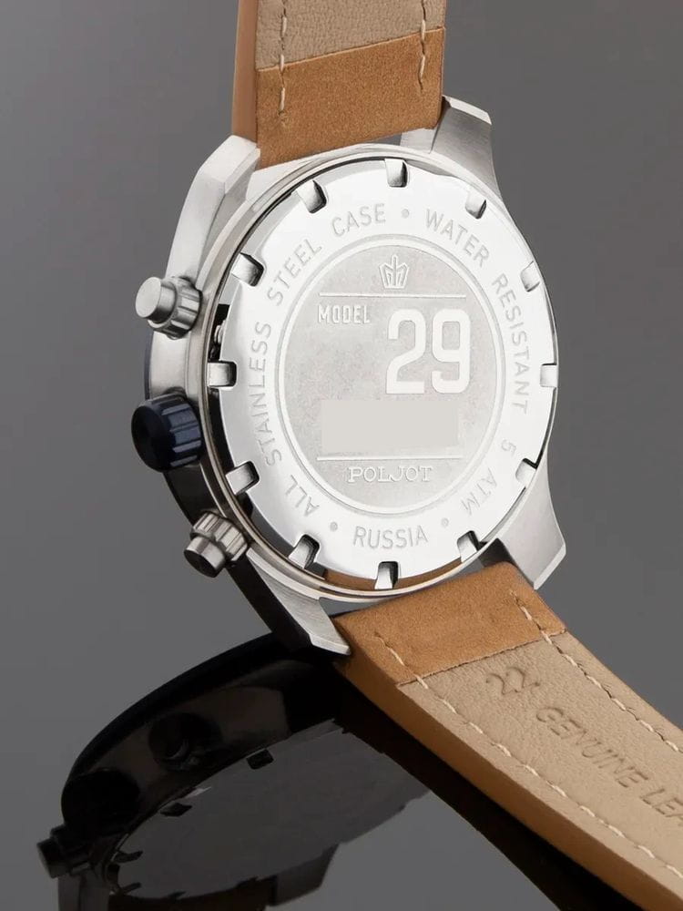Poljot VD55.291234 — выразительные мужские часы с ярким спортивным акцентом, созданные для тех, кто ценит функциональность и характерный дизайн. Корпус из нержавеющей стали подчёркивает мощь и надёжность модели, а циферблат с контрастными счётчиками хронографаХронографФункция позволяет измерять отрезки времени с особой точностью: часы, минуты, секунды. Верным признаком хронографа является наличие на циферблате 3 дополнительных окошек-счётчиков. придаёт образу динамику и энергичность. БезельБезельВнешний ободок, закрепляющий стекло. В спортивных часах так называется поворотное кольцо с делениями на циферблате, выполняет роль таймера – замеряет отрезки времени на шкале. Неподвижный безель – элемент декора. Однонаправленно вращающийся безель на дайверских часах позволяет фиксировать моменты погружения и выныривания на поверхность. с PVD-покрытиемPVDУльтратонкое покрытие наносится в технике вакуумного напыления, сочетает в себе нитрид титана особой прочности со слоем золота или оксида хрома. Несёт в себе декоративную или защитную функцию.. Механизм SEIKO VD55 (Япония) обеспечивает точную работу секундомера и надёжность в ежедневном использовании. Широкие стрелки и метки с люминесцентным покрытиемЛюминесцентное покрытиеПозволяет считывать показания времени в темноте. Производители наносят на стрелки, часовые индексы, безель или поверхность циферблата светонакопительный состав, дающий холодное свечение. гарантируют превосходную читаемость в любое время суток. Прочное минеральное стеклоМинеральное стеклоМинеральное стекло представляет собой искусственно выращенный минерал кварца. Такое стекло отличается особой устойчивостью к повреждениям и царапинам. Уступает по некоторым качествам сапфировому стеклу. защищает циферблат, а водозащита до 5 ATM делает часы устойчивыми к влаге. Ремешок из натуральной кожи с контрастной строчкой завершает образ, обеспечивая комфорт и элегантность. Poljot — это стиль и точность, объединённые в спортивной форме с фирменным русским характером.