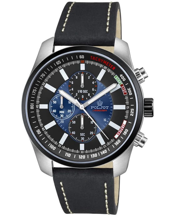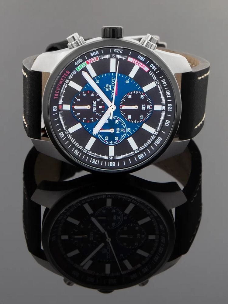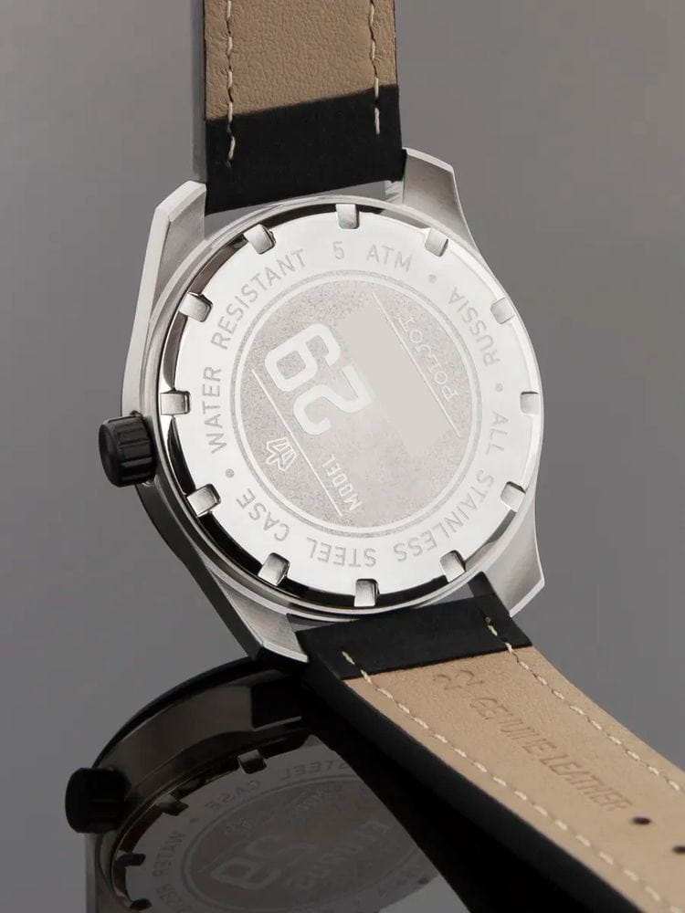 Poljot VD55.291235 — выразительные мужские часы с ярким спортивным акцентом, созданные для тех, кто ценит функциональность и характерный дизайн. Корпус из нержавеющей стали подчёркивает мощь и надёжность модели, а циферблат с контрастными счётчиками хронографаХронографФункция позволяет измерять отрезки времени с особой точностью: часы, минуты, секунды. Верным признаком хронографа является наличие на циферблате 3 дополнительных окошек-счётчиков. придаёт образу динамику и энергичность. БезельБезельВнешний ободок, закрепляющий стекло. В спортивных часах так называется поворотное кольцо с делениями на циферблате, выполняет роль таймера – замеряет отрезки времени на шкале. Неподвижный безель – элемент декора. Однонаправленно вращающийся безель на дайверских часах позволяет фиксировать моменты погружения и выныривания на поверхность. с PVD-покрытиемPVDУльтратонкое покрытие наносится в технике вакуумного напыления, сочетает в себе нитрид титана особой прочности со слоем золота или оксида хрома. Несёт в себе декоративную или защитную функцию.. Механизм SEIKO VD55 (Япония) обеспечивает точную работу секундомера и надёжность в ежедневном использовании. Широкие стрелки и метки с люминесцентным покрытиемЛюминесцентное покрытиеПозволяет считывать показания времени в темноте. Производители наносят на стрелки, часовые индексы, безель или поверхность циферблата светонакопительный состав, дающий холодное свечение. гарантируют превосходную читаемость в любое время суток. Прочное минеральное стеклоМинеральное стеклоМинеральное стекло представляет собой искусственно выращенный минерал кварца. Такое стекло отличается особой устойчивостью к повреждениям и царапинам. Уступает по некоторым качествам сапфировому стеклу. защищает циферблат, а водозащита до 5 ATM делает часы устойчивыми к влаге. Ремешок из натуральной кожи с контрастной строчкой завершает образ, обеспечивая комфорт и элегантность. Poljot — это стиль и точность, объединённые в спортивной форме с фирменным русским характером.