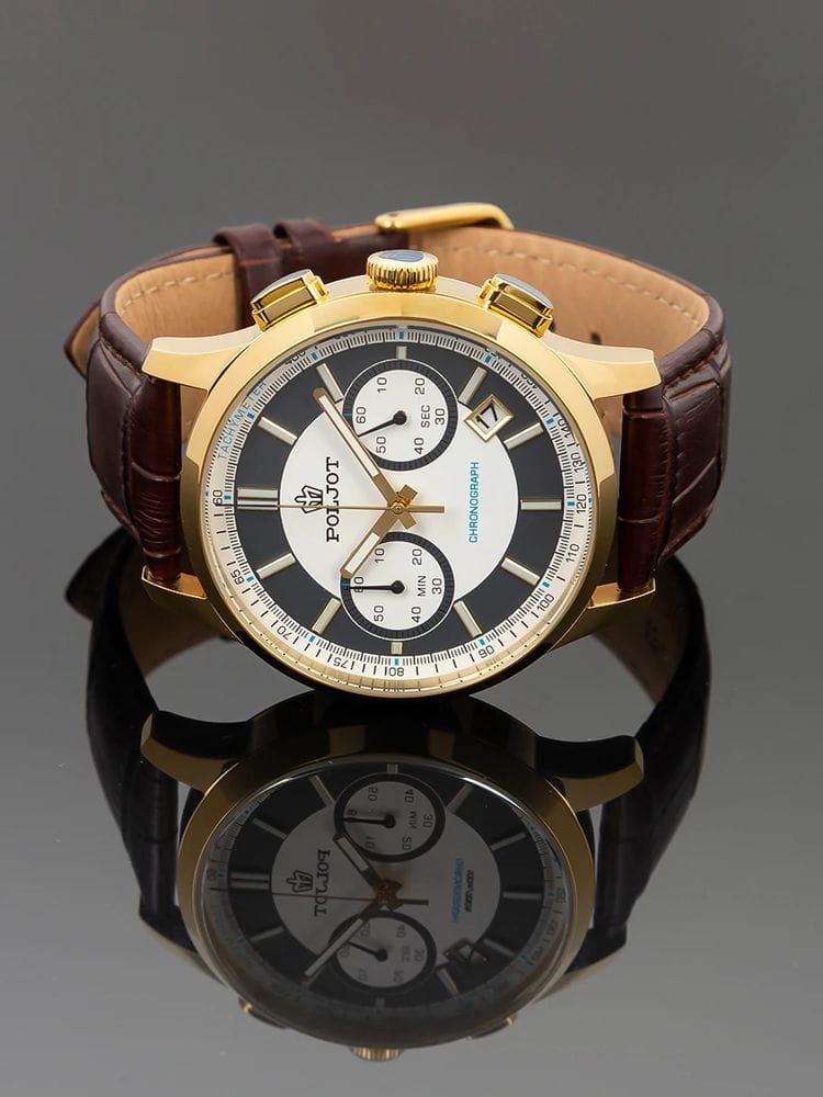 Poljot 6S21.906217 — современные мужские часы с выразительным спортивным дизайном и надёжной функциональностью. Корпус из нержавеющей стали с с PVD-покрытиемPVDУльтратонкое покрытие наносится в технике вакуумного напыления, сочетает в себе нитрид титана особой прочности со слоем золота или оксида хрома. Несёт в себе декоративную или защитную функцию. подчёркивает прочность и уверенный характер модели, а глубокий циферблат с счётчиками хронографаХронографФункция позволяет измерять отрезки времени с особой точностью: часы, минуты, секунды. Верным признаком хронографа является наличие на циферблате 3 дополнительных окошек-счётчиков. и аккуратным окном даты придаёт часам динамичный вид. Контрастные стрелки и метки с люминесцентным покрытиемЛюминесцентное покрытиеПозволяет считывать показания времени в темноте. Производители наносят на стрелки, часовые индексы, безель или поверхность циферблата светонакопительный состав, дающий холодное свечение. обеспечивают удобство считывания информации в любое время суток, а внешняя шкала тахиметраТахиметрРазмеченная шкала, располагается на ободке или безеле часов. Тахиметр позволяет рассчитать скорость на определённом участке пути, расстояние измеряется в километрах или милях. добавляет спортивную функциональность. Прочное минеральное стеклоМинеральное стеклоМинеральное стекло представляет собой искусственно выращенный минерал кварца. Такое стекло отличается особой устойчивостью к повреждениям и царапинам. Уступает по некоторым качествам сапфировому стеклу. защищает циферблат от царапин, а ремешок из натуральной кожи гарантирует комфорт и элегантную посадку на запястье. Poljot — это гармония классики и спортивного духа, созданная для мужчин, ценящих точность, надёжность и уверенный стиль.