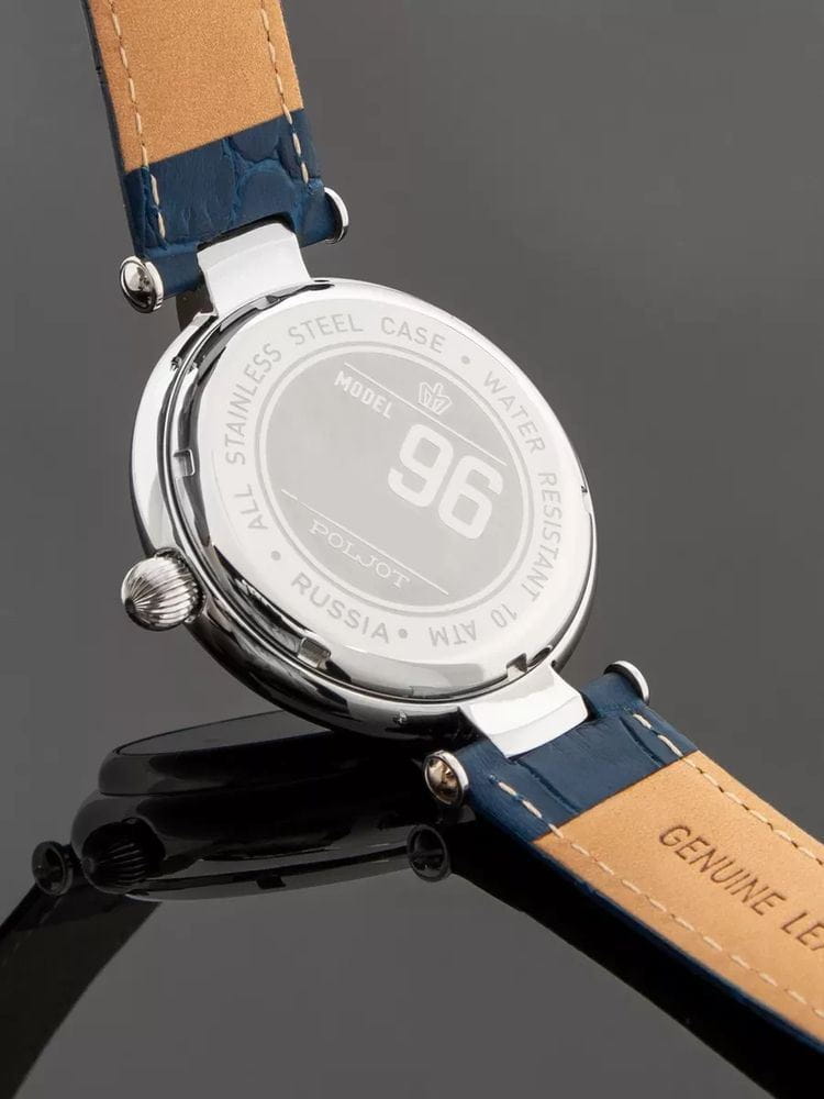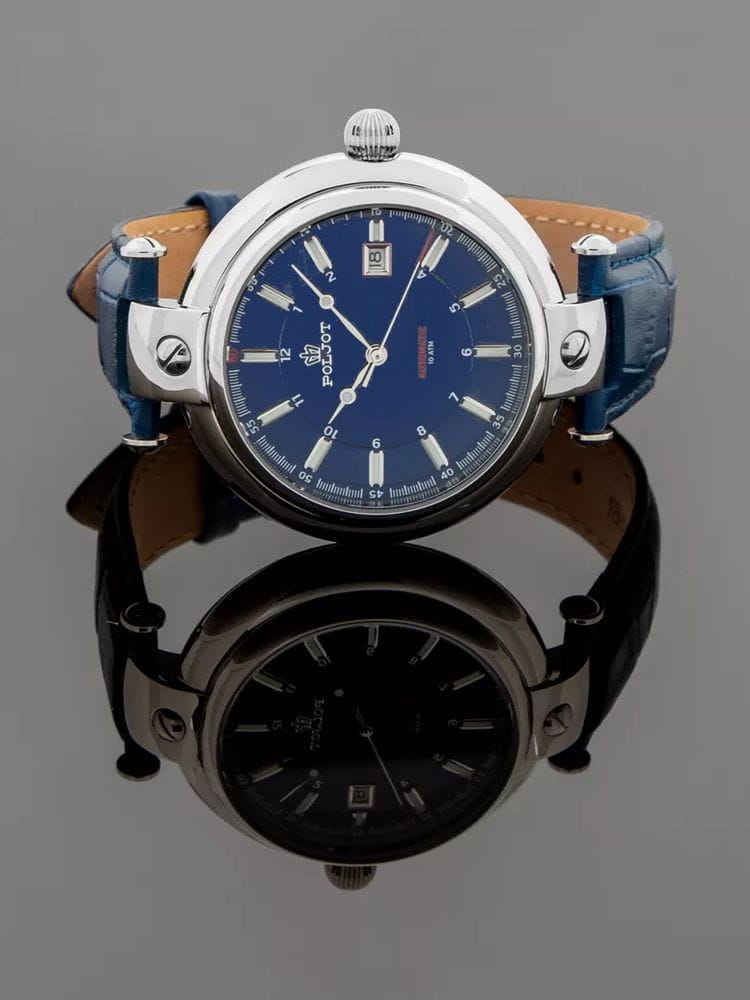 Poljot 8215.961155 “Baikal” — механические мужские часы с автоподзаводом, воплощающие традиции российского часового искусства и строгость классического дизайна. Крупный корпус из нержавеющей стали с характерными ушками придаёт модели мощный и узнаваемый силуэт, а насыщенный циферблат с аккуратной разметкой и окном даты на позиции «3 часов» подчёркивает лаконичность стиля. Механизм с автоподзаводом обеспечивает стабильную работу и плавное движение стрелок. Прочное минеральное стеклоМинеральное стеклоМинеральное стекло представляет собой искусственно выращенный минерал кварца. Такое стекло отличается особой устойчивостью к повреждениям и царапинам. Уступает по некоторым качествам сапфировому стеклу. надёжно защищает циферблат, а ремешок из натуральной кожи гарантирует комфорт и благородный внешний вид. Poljot — это часы для тех, кто ценит надёжность, традиции и спокойную уверенность в каждой детали.
