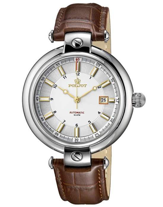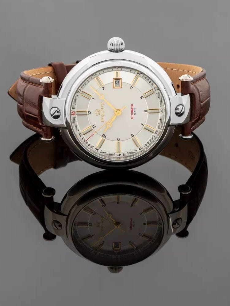 Poljot 8215.961158 “Baikal” — механические мужские часы с автоподзаводом, воплощающие традиции российского часового искусства и строгость классического дизайна. Крупный корпус из нержавеющей стали с характерными ушками придаёт модели мощный и узнаваемый силуэт, а насыщенный циферблат с аккуратной разметкой и окном даты на позиции «3 часов» подчёркивает лаконичность стиля. Механизм с автоподзаводом обеспечивает стабильную работу и плавное движение стрелок. Прочное минеральное стеклоМинеральное стеклоМинеральное стекло представляет собой искусственно выращенный минерал кварца. Такое стекло отличается особой устойчивостью к повреждениям и царапинам. Уступает по некоторым качествам сапфировому стеклу. надёжно защищает циферблат, а ремешок из натуральной кожи гарантирует комфорт и благородный внешний вид. Poljot — это часы для тех, кто ценит надёжность, традиции и спокойную уверенность в каждой детали.