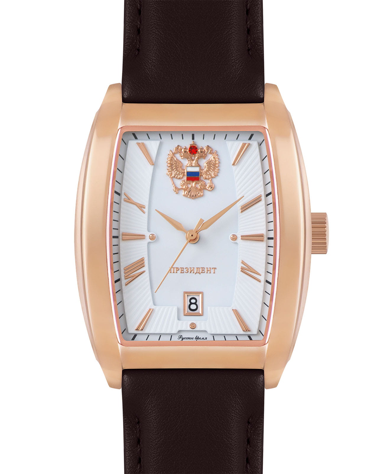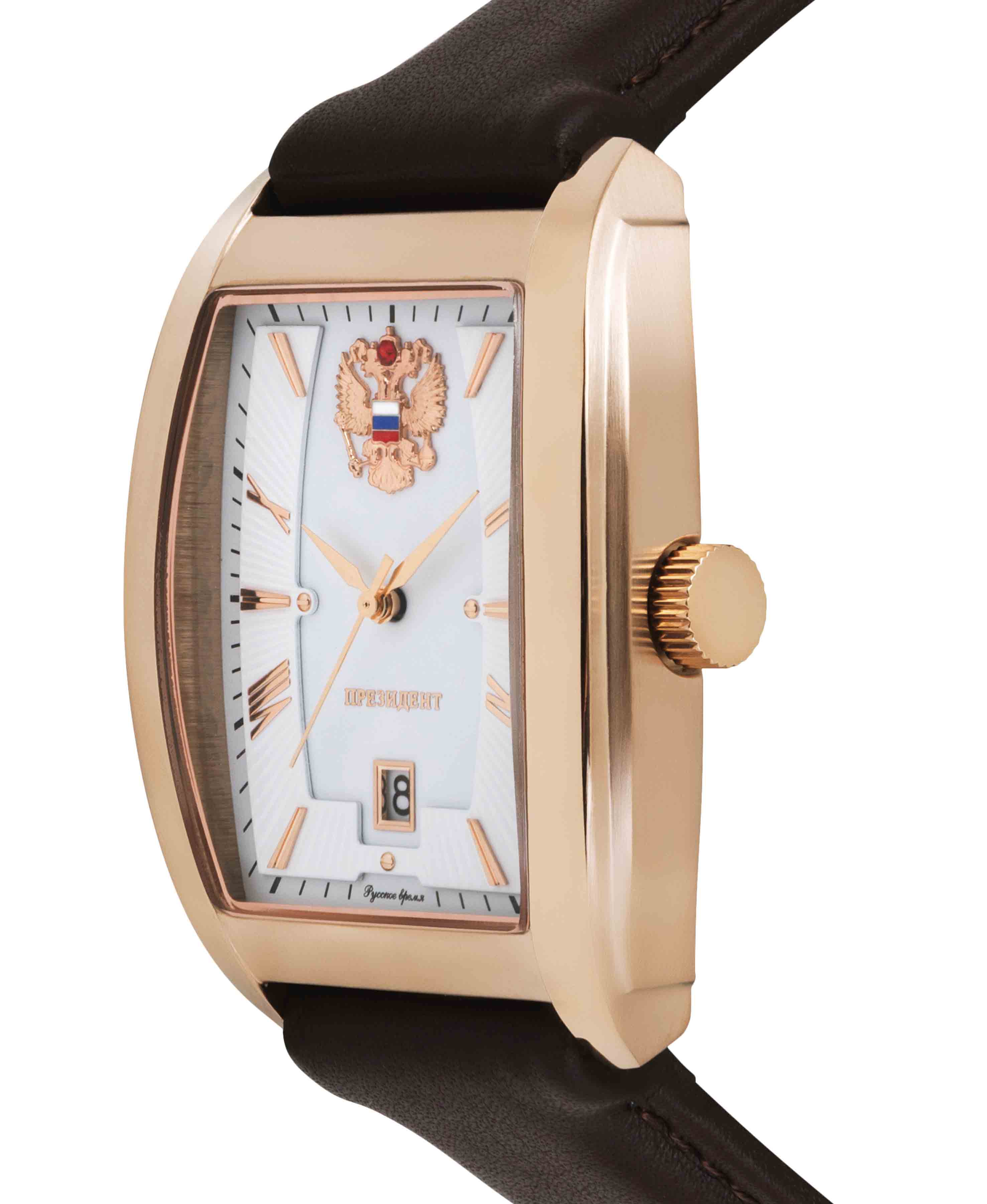 Мужские кварцевые часы из коллекции Президент — это сочетание строгого дизайна и статусного вида. Корпус прямоугольной формы выполнен в цвете розовое золото с PVD-покрытиемPVDУльтратонкое покрытие наносится в технике вакуумного напыления, сочетает в себе нитрид титана особой прочности со слоем золота или оксида хрома. Несёт в себе декоративную или защитную функцию. и защищён минеральным стекломМинеральное стеклоМинеральное стекло представляет собой искусственно выращенный минерал кварца. Такое стекло отличается особой устойчивостью к повреждениям и царапинам. Уступает по некоторым качествам сапфировому стеклу.. Циферблат дополнен окошком даты, расположенным на отметке 3 часа. Часы оснащены кожаным ремешком, обеспечивающим комфорт при ношении. Механизм — японский кварцевый Miyota, гарантирующий точное отсчёт времени. Водонепроницаемость 30 м позволяет использовать часы в повседневных условиях, защищая от случайных брызг и капель дождя. Комплектация включает подарочный футляр, паспорт с гарантийным талоном и фирменный пакет.