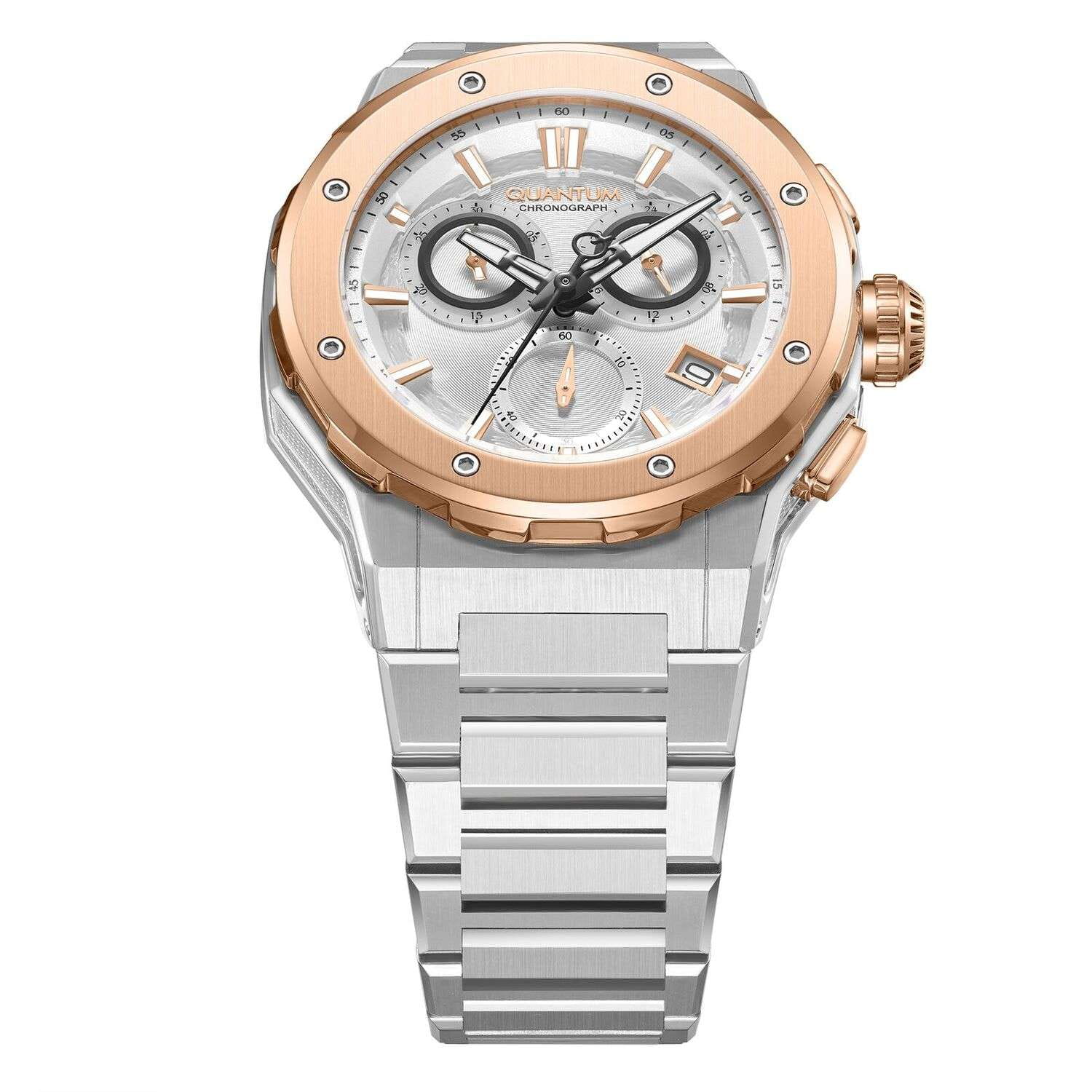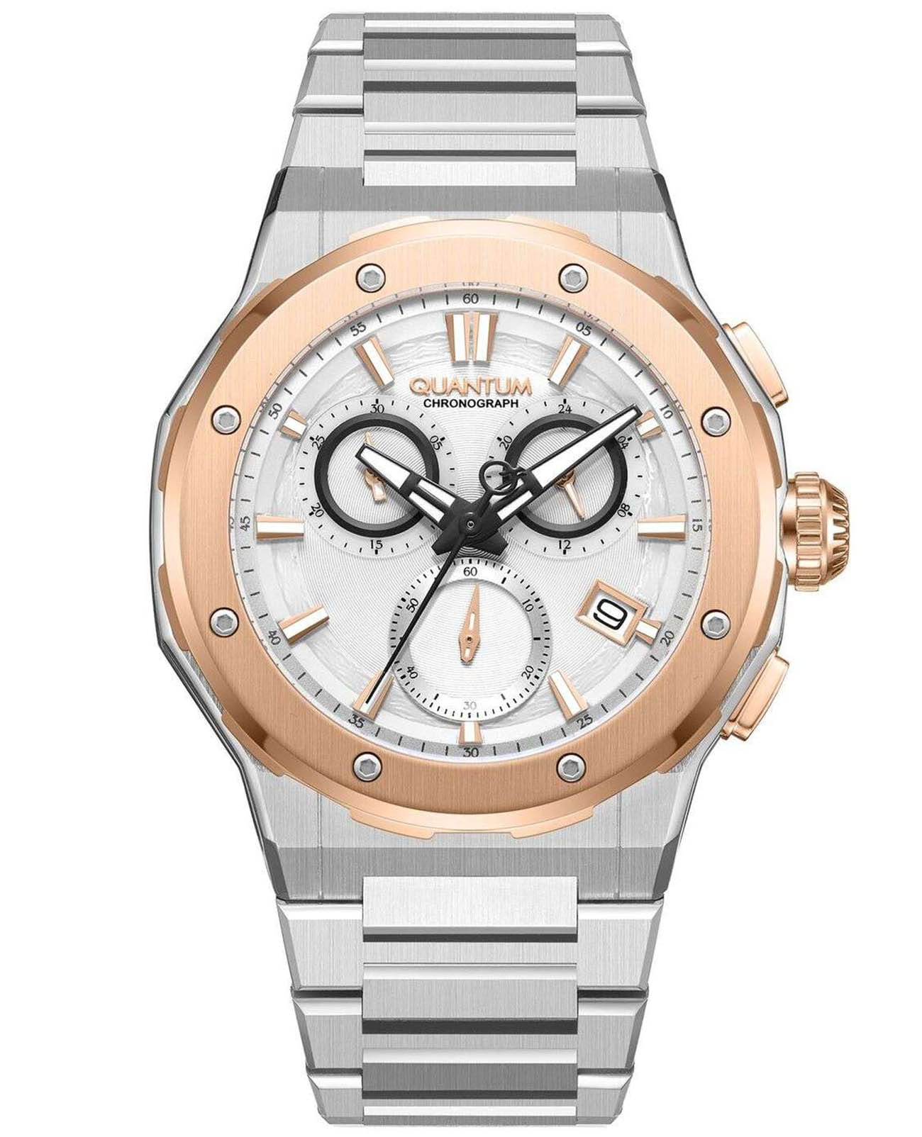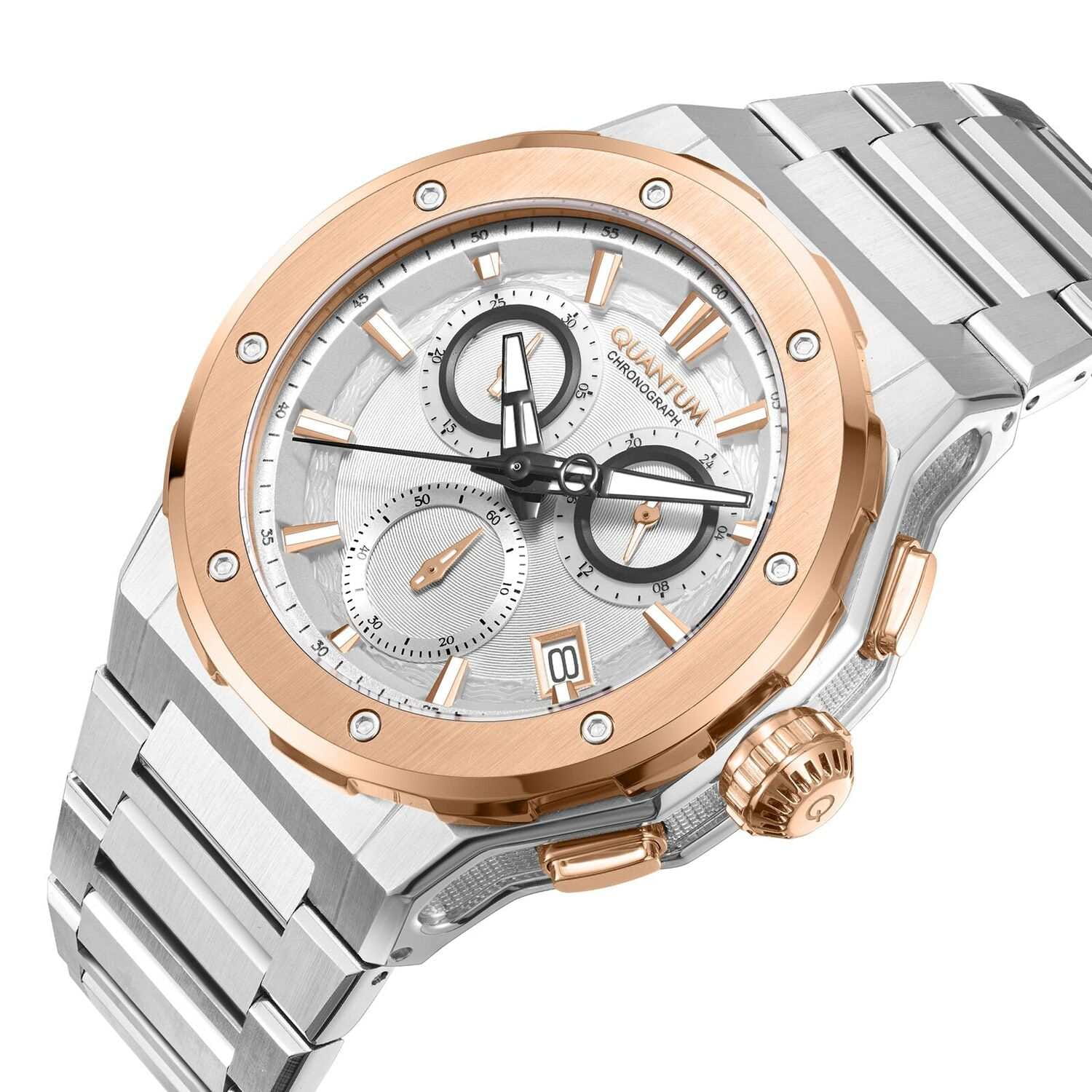 Мужские кварцевые часы Quantum HNG1081.530 из коллекции Hunter — функциональный хронограф в классическом круглом корпусе размером 46 мм из нержавеющей стали. БезельБезельВнешний ободок, закрепляющий стекло. В спортивных часах так называется поворотное кольцо с делениями на циферблате, выполняет роль таймера – замеряет отрезки времени на шкале. Неподвижный безель – элемент декора. Однонаправленно вращающийся безель на дайверских часах позволяет фиксировать моменты погружения и выныривания на поверхность. с PVD-покрытиемPVDУльтратонкое покрытие наносится в технике вакуумного напыления, сочетает в себе нитрид титана особой прочности со слоем золота или оксида хрома. Несёт в себе декоративную или защитную функцию.. Циферблат оснащён окошком даты, 24-часовым форматом времени на малом циферблате и функцией хронографаХронографФункция позволяет измерять отрезки времени с особой точностью: часы, минуты, секунды. Верным признаком хронографа является наличие на циферблате 3 дополнительных окошек-счётчиков. с секундомером. Стекло — минеральноеМинеральное стеклоМинеральное стекло представляет собой искусственно выращенный минерал кварца. Такое стекло отличается особой устойчивостью к повреждениям и царапинам. Уступает по некоторым качествам сапфировому стеклу. с антибликовым покрытием. Стрелки с люминесцентным покрытиемЛюминесцентное покрытиеПозволяет считывать показания времени в темноте. Производители наносят на стрелки, часовые индексы, безель или поверхность циферблата светонакопительный состав, дающий холодное свечение.. Водонепроницаемость 100 м. Браслет — стальной на раскладной застёжкеРаскладная застёжкаТакой тип застёжки используется только на браслетах из металла. Она никогда не раскрывается полностью, происходит разделение на 2 и более частей. Раскладывающая застёжка снизит вероятность потери часов к минимуму.. Идеальный выбор для тех, кто ценит турецкий дизайн и повседневную практичность.