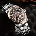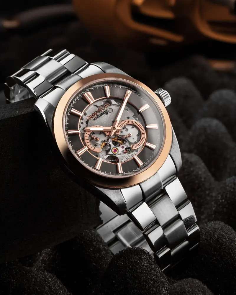 Мужские механические часы с автоподзаводом Quantum Q-Master — это классический и функциональный аксессуар. Корпус диаметром 41 мм выполнен из нержавеющей стали. БезельБезельВнешний ободок, закрепляющий стекло. В спортивных часах так называется поворотное кольцо с делениями на циферблате, выполняет роль таймера – замеряет отрезки времени на шкале. Неподвижный безель – элемент декора. Однонаправленно вращающийся безель на дайверских часах позволяет фиксировать моменты погружения и выныривания на поверхность. с IP-покрытиемIP-покрытиеМетод ионного напыления. Демонстрирует повышенную устойчивость к истиранию, окислению и химическим веществам. Под воздействием высокого давления и температуры около 1500°C молекулы металла надёжно соединяются с частицами корпуса часов.. Циферблат чёрного цвета частично скелетонизированный, оформлен штрихами и стрелками. Присутствуют два вынесенных субциферблата: для отображения секунд и 24-часового формата времени. Циферблат защищён сапфировым стекломСапфировое стеклоПрочный и надёжный материал из кристалла сапфира синтетического происхождения, характеризующийся особой твёрдостью и устойчивостью к царапинам и повреждениям.. Прозрачная завинчивающаяся задняя крышка позволяет наблюдать за работой механизма. Стрелки с люминесцентным покрытиемЛюминесцентное покрытиеПозволяет считывать показания времени в темноте. Производители наносят на стрелки, часовые индексы, безель или поверхность циферблата светонакопительный состав, дающий холодное свечение., обеспечивающим хорошую читаемость в темноте. Часы оснащены стальным браслетом на раскладной застёжке с фиксаторомРаскладная застёжкаТакой тип застёжки используется только на браслетах из металла. Она никогда не раскрывается полностью, происходит разделение на 2 и более частей. Раскладывающая застёжка снизит вероятность потери часов к минимуму.. Водонепроницаемость 50 м позволяет использовать часы при мытье рук или в дождь. Идеальный выбор для тех, кто ценит турецкое качество и универсальный дизайн.