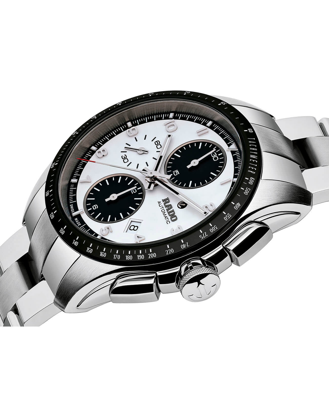 Классический хронографХронографФункция позволяет измерять отрезки времени с особой точностью: часы, минуты, секунды. Верным признаком хронографа является наличие на циферблате 3 дополнительных окошек-счётчиков. с элементами спортивного дизайна идеально подойдёт к образу солидного и делового мужчины. Винтажным элементом стал оригинальный дизайн «panda-style». Серебристо-чёрная расцветка позволяет носить часы при любых обстоятельствах. Модель оснащена швейцарским автоматическим механизмом ETA A05.H21, запас хода которого увеличен до 54 часов. Скелетонизированная задняя крышка корпуса. Стекло из сапфира с антибликовым покрытием. Корпус и браслет из стали 316L с антикоррозионными свойствами. Чёрный безельБезельВнешний ободок, закрепляющий стекло. В спортивных часах так называется поворотное кольцо с делениями на циферблате, выполняет роль таймера – замеряет отрезки времени на шкале. Неподвижный безель – элемент декора. Однонаправленно вращающийся безель на дайверских часах позволяет фиксировать моменты погружения и выныривания на поверхность. из высокотехнологичной керамикиВысокотехнологичная керамикаИнновационный запатентованный Rado материал с гладкой или матовой поверхностью. Керамика за счёт кристаллической структуры обладает повышенной устойчивостью от возникновения царапин. Материал способен принимать температуру тела человека, обеспечивая невероятный комфорт при ношении.. Люминесцентная подсветкаЛюминесцентное покрытиеПозволяет считывать показания времени в темноте. Производители наносят на стрелки, часовые индексы, безель или поверхность циферблата светонакопительный состав, дающий холодное свечение. стрелок. Водонепроницаемость 100 метров. Секундомер, отображение даты, шкала тахиметраТахиметрРазмеченная шкала, располагается на ободке или безеле часов. Тахиметр позволяет рассчитать скорость на определённом участке пути, расстояние измеряется в километрах или милях.. . Диаметр корпуса: 44 мм.