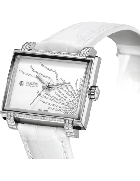 Дизайн модели является действительно роскошным - светлый циферблат дополнен сияющими драгоценными камнями. Циферблат украшен узором из 34 бриллиантов. Корпус украшен 40 бриллиантами. Сапфировое стекло с антибликовой обработкой. Корпус из плазменной керамикиВысокотехнологичная плазменная керамикаИнновационный материал, технология запатентована. Выплавление керамики осуществляется в печи при 20 000 °C, белоснежный материал под воздействием ультравысокой температуры приобретает уникальный блеск, присущий металлам.. Прозрачная задняя крышка. Ремешок из натуральной кожи с системой быстрой установки. Водостойкость 50 метров. Диаметр корпуса: 35 мм.