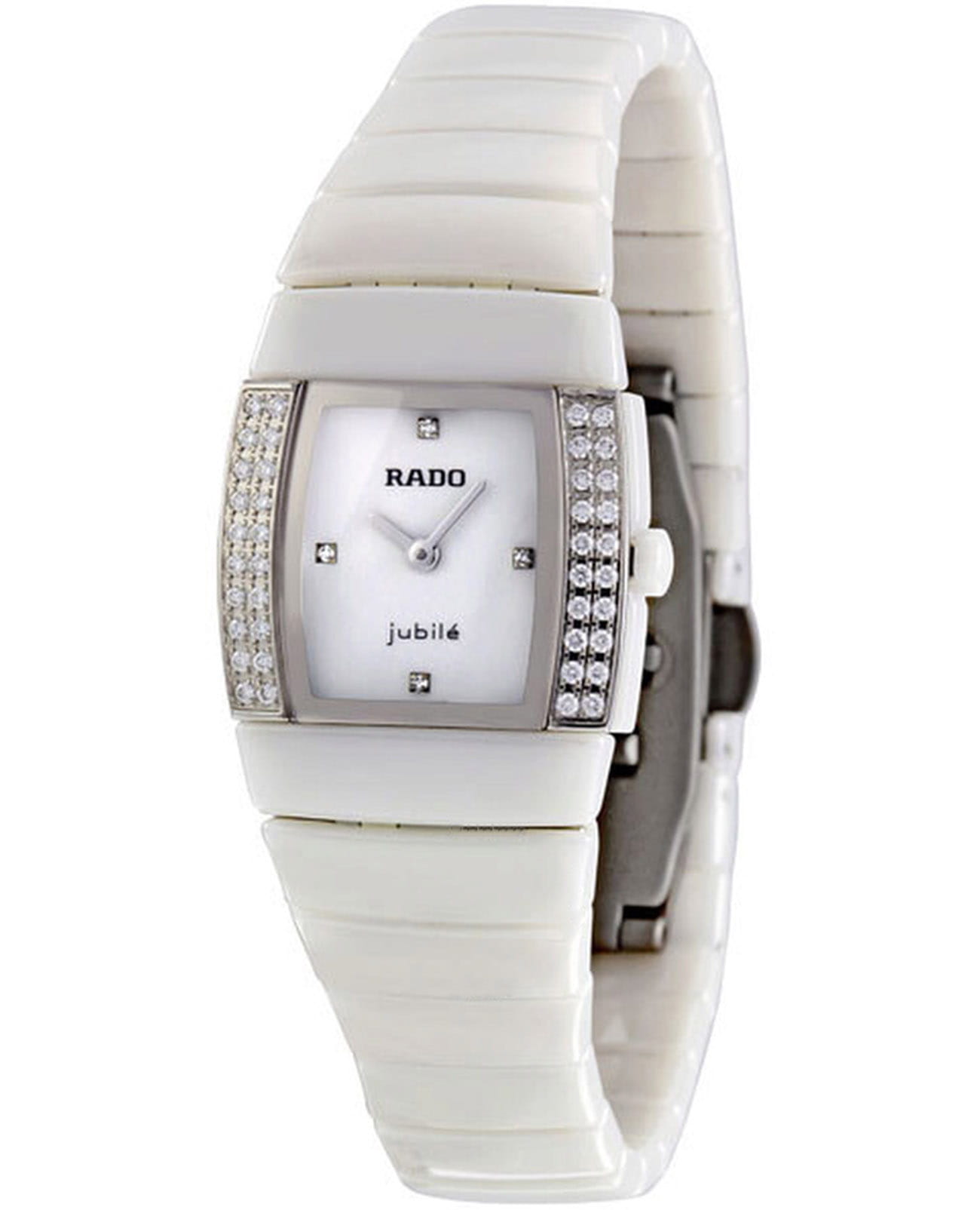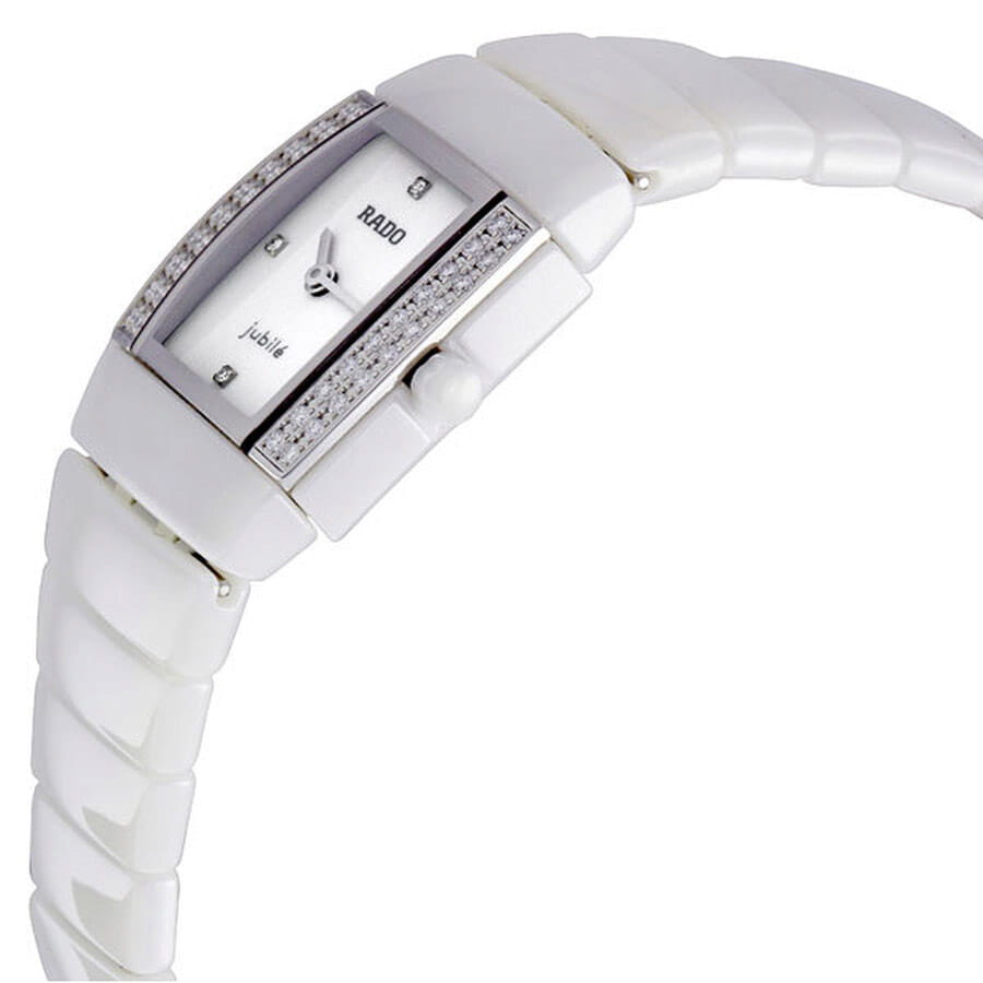 Часы Rado Sintra R13633702, произведение искусства и технологическое чудо, станут прекрасным дополнением к коллекции. Эти швейцарские часы оснащены кварцевым механизмом и тремя стрелками, заключенным в корпус из нержавеющей стали. Браслет изготовлен из высокотехнологичной керамикиВысокотехнологичная керамикаИнновационный запатентованный Rado материал с гладкой или матовой поверхностью. Керамика за счёт кристаллической структуры обладает повышенной устойчивостью от возникновения царапин. Материал способен принимать температуру тела человека, обеспечивая невероятный комфорт при ношении.. Корпус украшен 40 бриллиантами, циферблат 4 бриллианта. Сапфировое стеклоСапфировое стеклоПрочный и надёжный материал из кристалла сапфира синтетического происхождения, характеризующийся особой твёрдостью и устойчивостью к царапинам и повреждениям. устойчивое к появлению царапин, обладающее высокой прозрачностью. Класс водозащиты: 30 метров, позволит защитить корпус от случайных брызг или капель дождя.