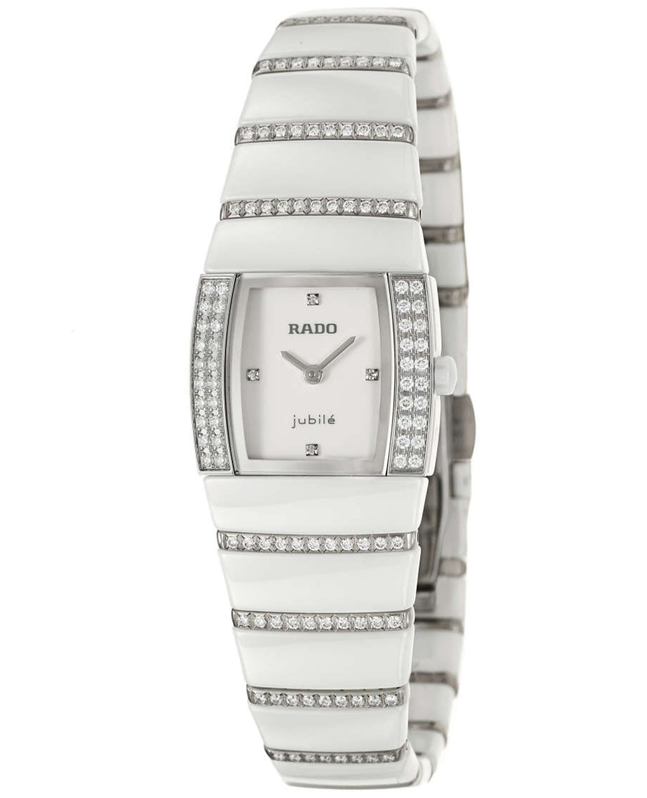 Часы Rado Sintra R13831703, произведение искусства и технологическое чудо, станут прекрасным дополнением к коллекции. Эти швейцарские часы оснащены кварцевым механизмом с указателем даты и тремя стрелками, заключенным в корпус из высокотехнологичной керамикиВысокотехнологичная керамикаИнновационный запатентованный Rado материал с гладкой или матовой поверхностью. Керамика за счёт кристаллической структуры обладает повышенной устойчивостью от возникновения царапин. Материал способен принимать температуру тела человека, обеспечивая невероятный комфорт при ношении..  Браслет изготовлен из высокотехнологичной керамикиВысокотехнологичная керамикаИнновационный запатентованный Rado материал с гладкой или матовой поверхностью. Керамика за счёт кристаллической структуры обладает повышенной устойчивостью от возникновения царапин. Материал способен принимать температуру тела человека, обеспечивая невероятный комфорт при ношении. с накладками из белого золота 18К18-каратное золотоОбозначение по каратной системе пробирования, оно показывает, сколько драгоценного металла содержится в изделии. 18 карат - в составе 75% чистого золота, соответствует 750 пробе.