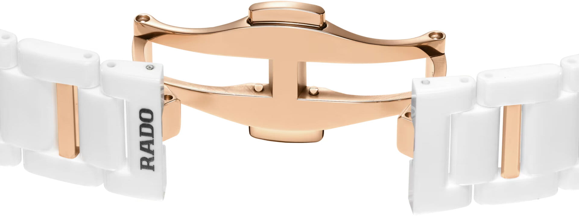 Женские кварцевые часы Rado — это изысканный аксессуар с современным дизайном. Корпус диаметром 31 мм выполнен из высокотехнологичной керамикиВысокотехнологичная керамикаИнновационный запатентованный Rado материал с гладкой или матовой поверхностью. Керамика за счёт кристаллической структуры обладает повышенной устойчивостью от возникновения царапин. Материал способен принимать температуру тела человека, обеспечивая невероятный комфорт при ношении. и нержавеющей стали с PVD-покрытиемPVDУльтратонкое покрытие наносится в технике вакуумного напыления, сочетает в себе нитрид титана особой прочности со слоем золота или оксида хрома. Несёт в себе декоративную или защитную функцию. розового золота. Циферблат белого цвета оформлен аналоговым дисплеем. Циферблат защищён выпуклым сапфировым стекломСапфировое стеклоПрочный и надёжный материал из кристалла сапфира синтетического происхождения, характеризующийся особой твёрдостью и устойчивостью к царапинам и повреждениям.. Окошко даты расположено в положении 3 часов. Механизм — кварцевый. Часы оснащены браслетом из комбинации керамики и стали с PVD-покрытиемPVDУльтратонкое покрытие наносится в технике вакуумного напыления, сочетает в себе нитрид титана особой прочности со слоем золота или оксида хрома. Несёт в себе декоративную или защитную функцию. и застёжкой «бабочка» с кнопкамиЗастёжка "бабочка"Такой вид застёжки дополняется предохранителями, помогающими избежать случайного раскрытия браслета. Обладают изящным исполнением. . Водонепроницаемость 50 м позволяет использовать часы в повседневных условиях. Гарантия — 5 лет на механизм, 2 года на изделие. Идеальный выбор для тех, кто ценит стиль, качество и универсальность.