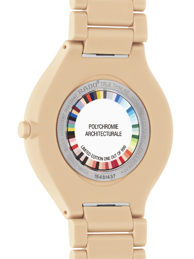 Швейцарские часы из лимитированной серии 999 экземпляров Rado True Thinline Le Corbusier R27097672 , кварцевый механизм с высокой точностью. Сапфировое стекло устойчивое к появлению царапин, обладающее высокой прозрачностью. Класс водозащиты: 30 метров, позволит защитить корпус от случайных брызг или капель дождя. Корпус часов изготовлен из керамики, золотистого цвета.