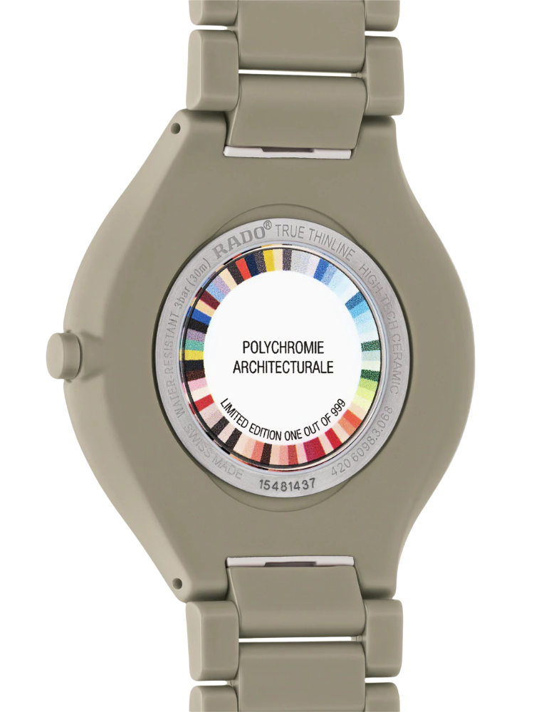 Швейцарские часы из лимитированной серии 999 экземпляров Rado True Thinline Le Corbusier R27098682 , кварцевый механизм с высокой точностью. Сапфировое стекло устойчивое к появлению царапин, обладающее высокой прозрачностью. Класс водозащиты: 30 метров, позволит защитить корпус от случайных брызг или капель дождя. Корпус часов изготовлен из керамики, цвета.