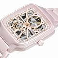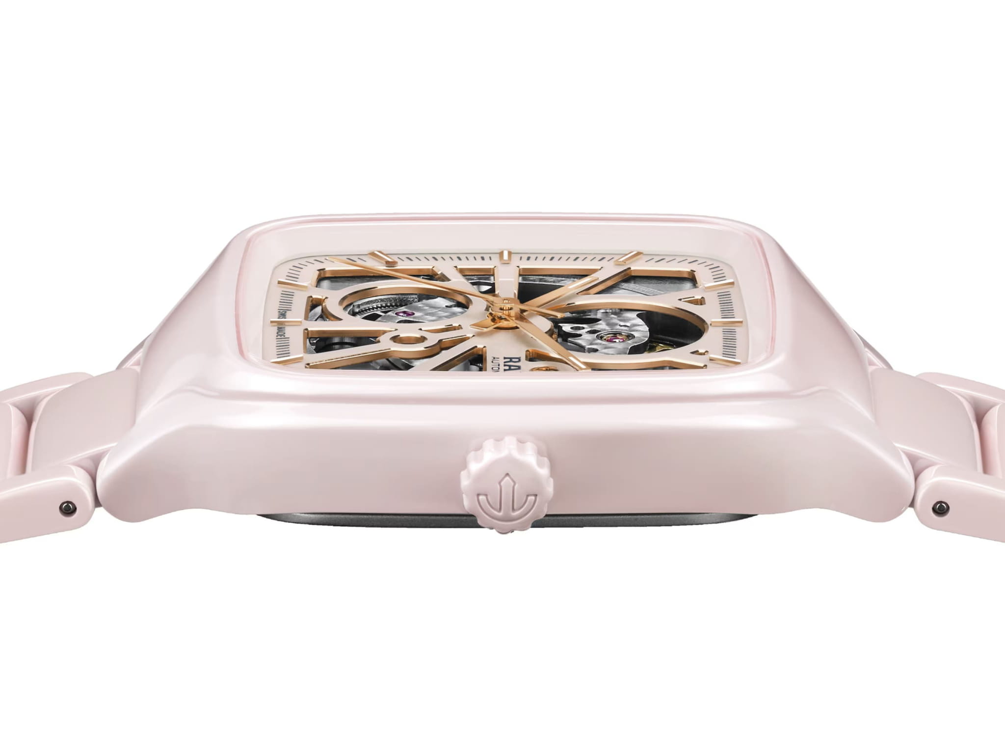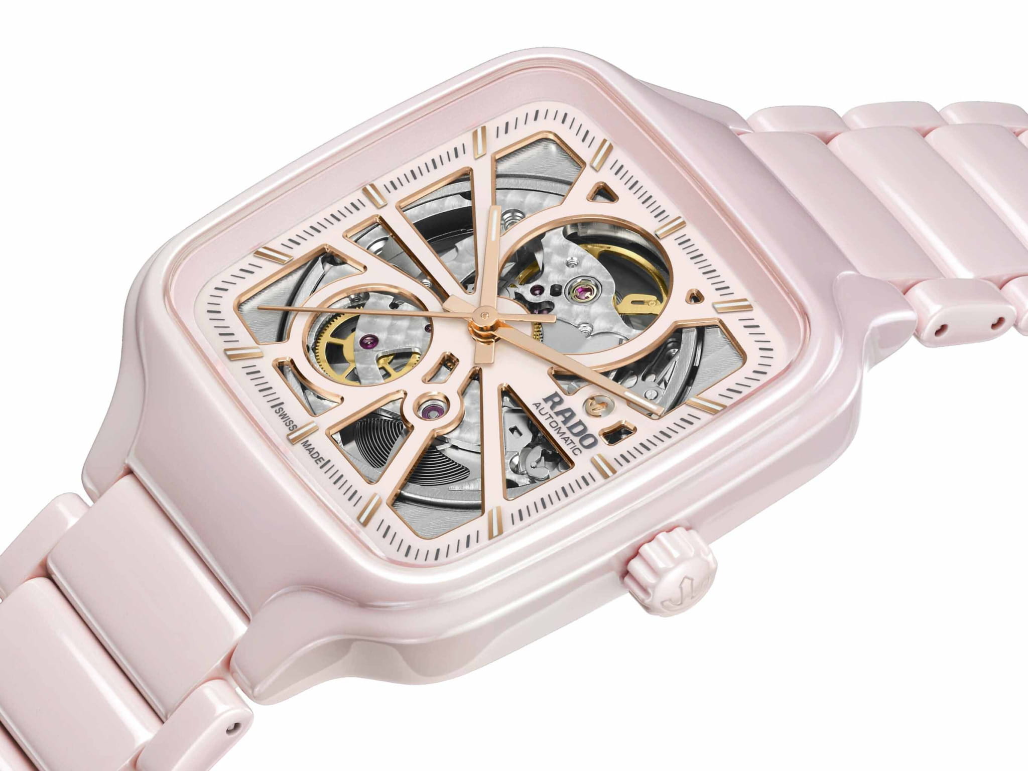Женские механические часы с автоподзаводом Rado из коллекции True Square — это уникальное сочетание передовых технологий и высокого часового искусства. Корпус квадратной формы, размером 38 мм и толщиной 9,7 мм, выполнен из цельного блока высокотехнологичной керамикиВысокотехнологичная керамикаИнновационный запатентованный Rado материал с гладкой или матовой поверхностью. Керамика за счёт кристаллической структуры обладает повышенной устойчивостью от возникновения царапин. Материал способен принимать температуру тела человека, обеспечивая невероятный комфорт при ношении. розового цвета, что обеспечивает лёгкость, гипоаллергенность и исключительную прочность. Циферблат бежевого цвета с эффектом «солнечные лучи» оформлен накладными индексами розового золота, заполненными люминесцентным покрытиемЛюминесцентное покрытиеПозволяет считывать показания времени в темноте. Производители наносят на стрелки, часовые индексы, безель или поверхность циферблата светонакопительный состав, дающий холодное свечение. Super-Luminova®. Особенностью модели является скелетонизированная архитектура «open heart», через которую видны декорированные элементы механизма: кольцевая шлифовка на видимой части механизма и узор «Côtes de Genève» на плате. В центре циферблата — подвижный якорь розового цвета, символ бренда. Циферблат защищён плоским сапфировым стекломСапфировое стеклоПрочный и надёжный материал из кристалла сапфира синтетического происхождения, характеризующийся особой твёрдостью и устойчивостью к царапинам и повреждениям.. Механизм — автоматический с запасом хода 80 часов, 25 камнями и антимагнитной пружиной Nivachron™Nivachron™Специально разработанный инновационный сплав Nivachron™ повышает устойчивость часов к воздействию магнитных полей.. Часы оснащены браслетом из высокотехнологичной керамикиВысокотехнологичная керамикаИнновационный запатентованный Rado материал с гладкой или матовой поверхностью. Керамика за счёт кристаллической структуры обладает повышенной устойчивостью от возникновения царапин. Материал способен принимать температуру тела человека, обеспечивая невероятный комфорт при ношении. розового цвета с застёжкой «бабочка» с кнопкамиЗастёжка "бабочка"Такой вид застёжки дополняется предохранителями, помогающими избежать случайного раскрытия браслета. Обладают изящным исполнением. из титана. Водонепроницаемость 50 м позволяет использовать часы в повседневных условиях. Гарантия — 2 года. Идеальный выбор для тех, кто ценит инновации, дизайн и швейцарское качество.