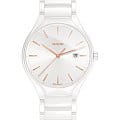 Глянцевый корпус представлен в оригинальном дизайне, его линии плавно перетекают в браслет. Наручные часы выполнены из высокотехнологичной плазменной керамикиВысокотехнологичная плазменная керамикаИнновационный материал, технология запатентована. Выплавление керамики осуществляется в печи при 20 000 °C, белоснежный материал под воздействием ультравысокой температуры приобретает уникальный блеск, присущий металлам., материал не вызывает аллергии и обеспечивает невероятный комфорт при ношении. Швейцарский кварцевый калибр ETA 955.112. Сапфировое стекло устойчиво к образованию царапин. Водостойкость 5 бар. . Отображение даты в положении "3 часа". Диаметр корпуса: 40 мм.