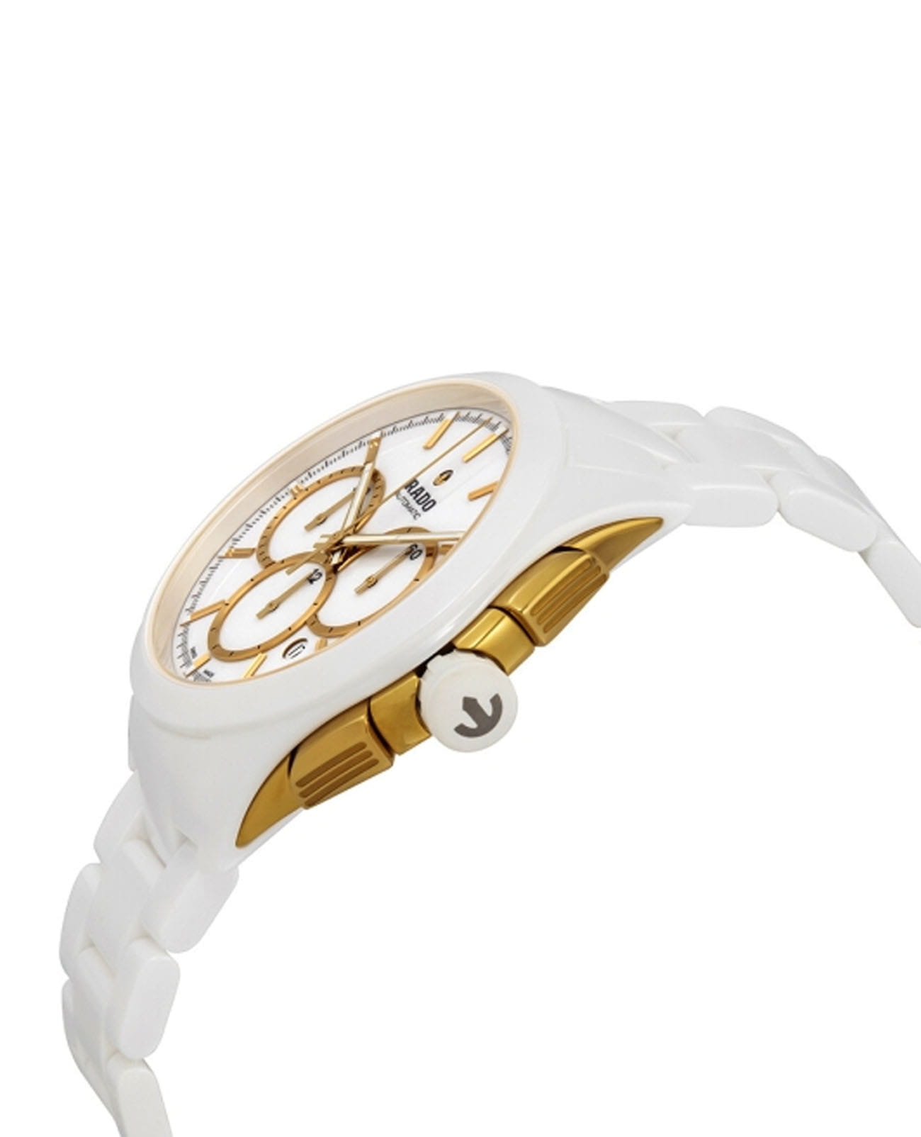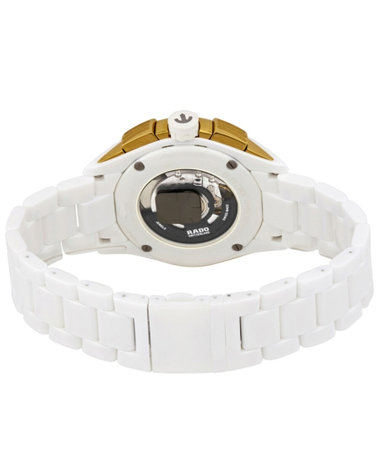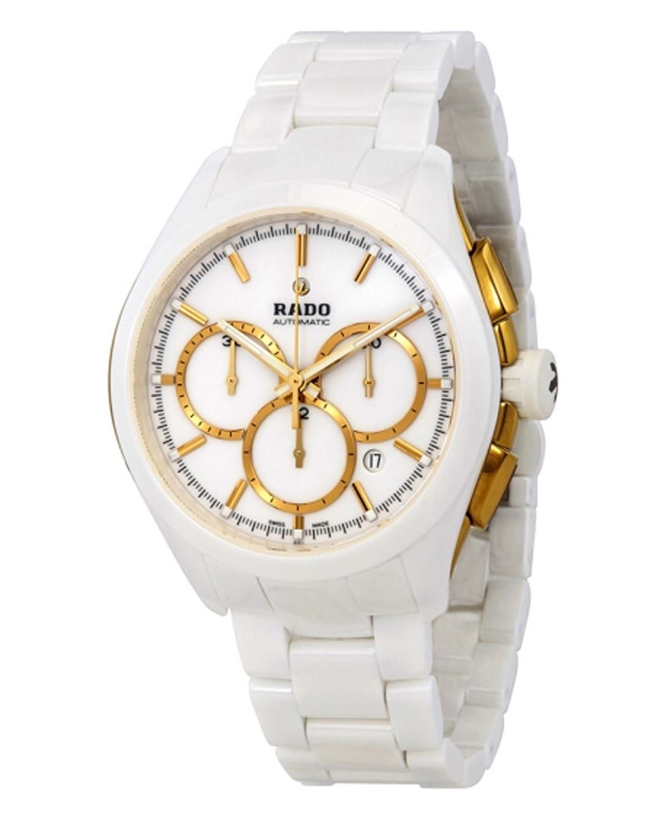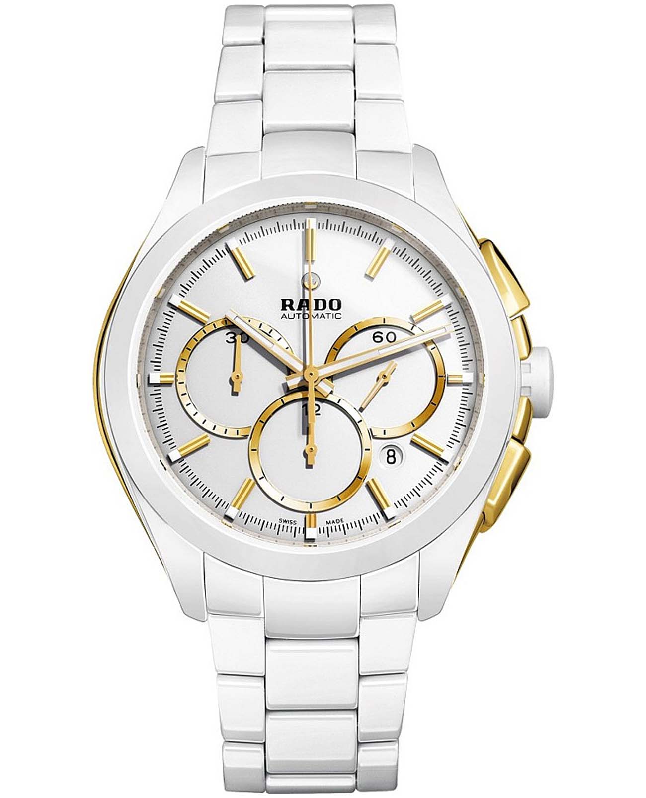 Мужские механические швейцарские часы- хронографХронографФункция позволяет измерять отрезки времени с особой точностью: часы, минуты, секунды. Верным признаком хронографа является наличие на циферблате 3 дополнительных окошек-счётчиков. с автоподзаводом Rado HyperChrome Automatic Chronograph R32037012. Сапфировое стеклоСапфировое стеклоПрочный и надёжный материал из кристалла сапфира синтетического происхождения, характеризующийся особой твёрдостью и устойчивостью к царапинам и повреждениям. устойчивое к мелким механическим повреждениям. Корпус часов изготовлен из нержавеющей стали с PVD-покрытиемPVDУльтратонкое покрытие наносится в технике вакуумного напыления, сочетает в себе нитрид титана особой прочности со слоем золота или оксида хрома. Несёт в себе декоративную или защитную функцию. и высокотехнологичной керамикиВысокотехнологичная керамикаИнновационный запатентованный Rado материал с гладкой или матовой поверхностью. Керамика за счёт кристаллической структуры обладает повышенной устойчивостью от возникновения царапин. Материал способен принимать температуру тела человека, обеспечивая невероятный комфорт при ношении.. Окошко даты находится в положении между 4 и 5 часами. Стрелки с люминесцентным покрытиемЛюминесцентное покрытиеПозволяет считывать показания времени в темноте. Производители наносят на стрелки, часовые индексы, безель или поверхность циферблата светонакопительный состав, дающий холодное свечение.. Класс водозащиты: 100 метров, позволит плавать, нырять и заниматься другими водными видами спорта. Браслет из высокотехнологичной керамикиВысокотехнологичная керамикаИнновационный запатентованный Rado материал с гладкой или матовой поверхностью. Керамика за счёт кристаллической структуры обладает повышенной устойчивостью от возникновения царапин. Материал способен принимать температуру тела человека, обеспечивая невероятный комфорт при ношении. на раскладной застёжкеРаскладная застёжкаТакой тип застёжки используется только на браслетах из металла. Она никогда не раскрывается полностью, происходит разделение на 2 и более частей. Раскладывающая застёжка снизит вероятность потери часов к минимуму..