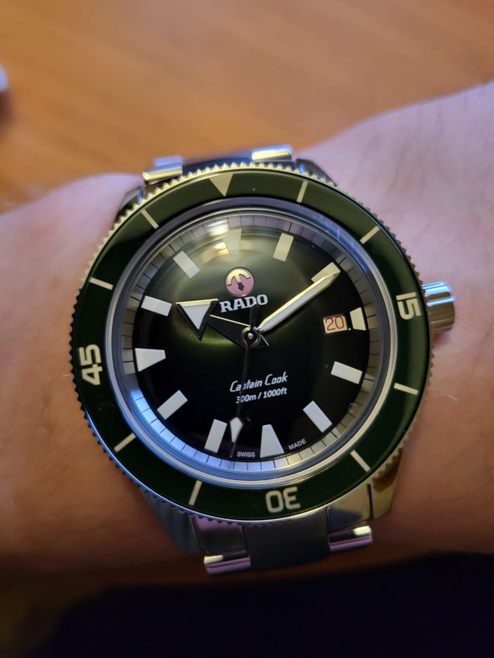 Премиальная модель обладает винтажным характером, зелёный циферблат обращает наше внимание на оригинальные стрелки в виде меча и стрелы. Часы обладают высокими показателями водонепроницаемости - сохранение герметичности до 30 бар, что стало возможным благодаря задней крышке и заводной головке с винтовыми фиксаторами. Автоподзавод. Швейцарский калибр ETA C07.611 с 80-часовым резервом хода. Антибликовая обработка сапфирового стекла. Корпус из хирургической стали 316L, безельБезельВнешний ободок, закрепляющий стекло. В спортивных часах так называется поворотное кольцо с делениями на циферблате, выполняет роль таймера – замеряет отрезки времени на шкале. Неподвижный безель – элемент декора. Однонаправленно вращающийся безель на дайверских часах позволяет фиксировать моменты погружения и выныривания на поверхность. из высокотехнологичной керамикиВысокотехнологичная керамикаИнновационный запатентованный Rado материал с гладкой или матовой поверхностью. Керамика за счёт кристаллической структуры обладает повышенной устойчивостью от возникновения царапин. Материал способен принимать температуру тела человека, обеспечивая невероятный комфорт при ношении.. Прочный стальной браслет. Отображение числа. Диаметр корпуса: 42 мм.