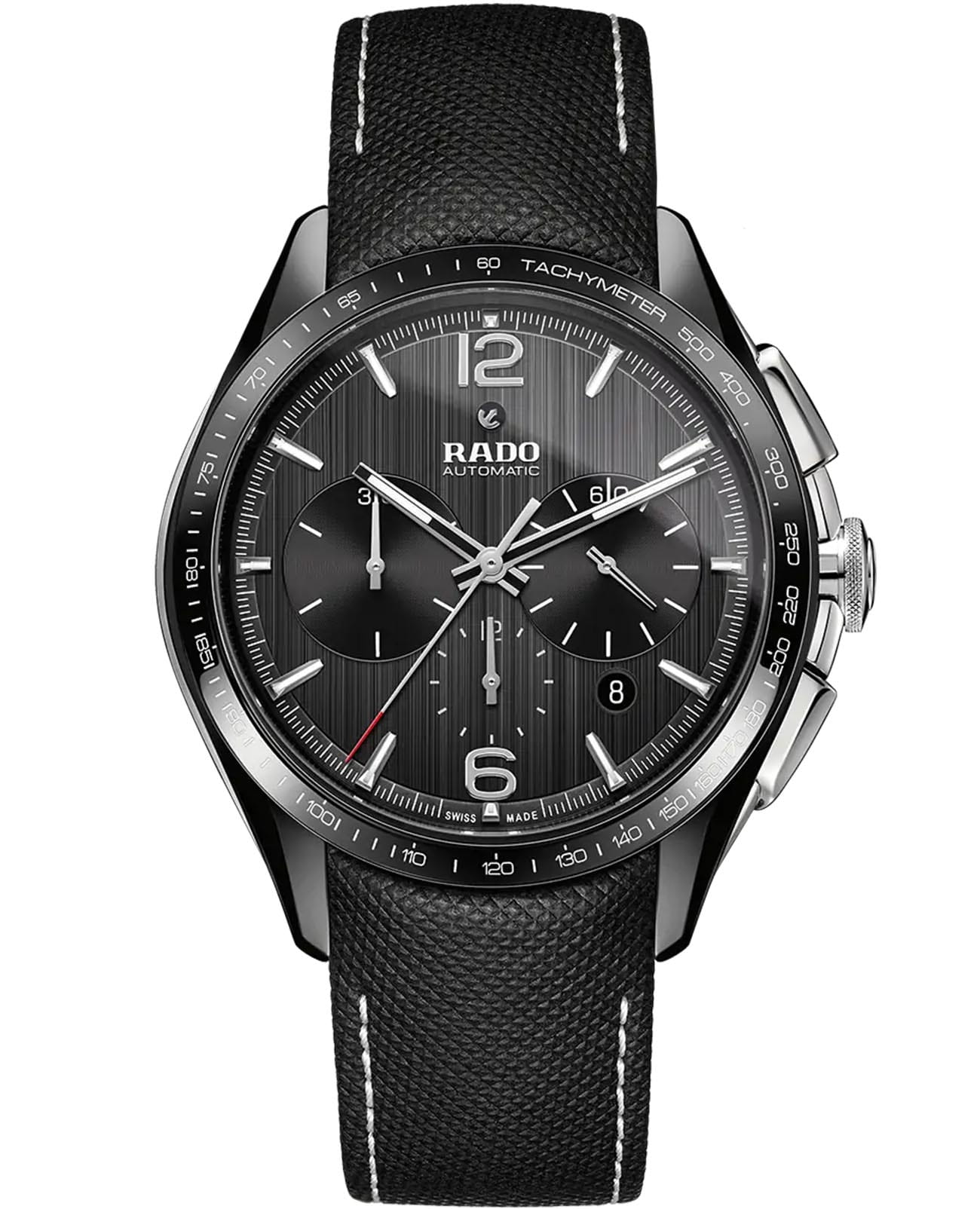 Мужские швейцарские часы-хронографХронографФункция позволяет измерять отрезки времени с особой точностью: часы, минуты, секунды. Верным признаком хронографа является наличие на циферблате 3 дополнительных окошек-счётчиков. Rado HyperChrome Automatic Chronograph R32121155. Корпус часов изготовлен из нержавеющей стали с PVD-покрытиемPVDУльтратонкое покрытие наносится в технике вакуумного напыления, сочетает в себе нитрид титана особой прочности со слоем золота или оксида хрома. Несёт в себе декоративную или защитную функцию. и высокотехнологичной керамикиВысокотехнологичная керамикаИнновационный запатентованный Rado материал с гладкой или матовой поверхностью. Керамика за счёт кристаллической структуры обладает повышенной устойчивостью от возникновения царапин. Материал способен принимать температуру тела человека, обеспечивая невероятный комфорт при ношении.. Тканевый ремешок на стандартной застёжке. Сапфировое стеклоСапфировое стеклоПрочный и надёжный материал из кристалла сапфира синтетического происхождения, характеризующийся особой твёрдостью и устойчивостью к царапинам и повреждениям. устойчивое к мелким механическим повреждениям. Стрелки и метки с люминесцентным покрытиемЛюминесцентное покрытиеПозволяет считывать показания времени в темноте. Производители наносят на стрелки, часовые индексы, безель или поверхность циферблата светонакопительный состав, дающий холодное свечение.. Окошко даты находится в положении между 4 и 5 часов. Класс водозащиты: 100 метров, позволит плавать, нырять и заниматься другими водными видами спорта. БезельБезельВнешний ободок, закрепляющий стекло. В спортивных часах так называется поворотное кольцо с делениями на циферблате, выполняет роль таймера – замеряет отрезки времени на шкале. Неподвижный безель – элемент декора. Однонаправленно вращающийся безель на дайверских часах позволяет фиксировать моменты погружения и выныривания на поверхность. со шкалой тахиметраТахиметрРазмеченная шкала, располагается на ободке или безеле часов. Тахиметр позволяет рассчитать скорость на определённом участке пути, расстояние измеряется в километрах или милях..