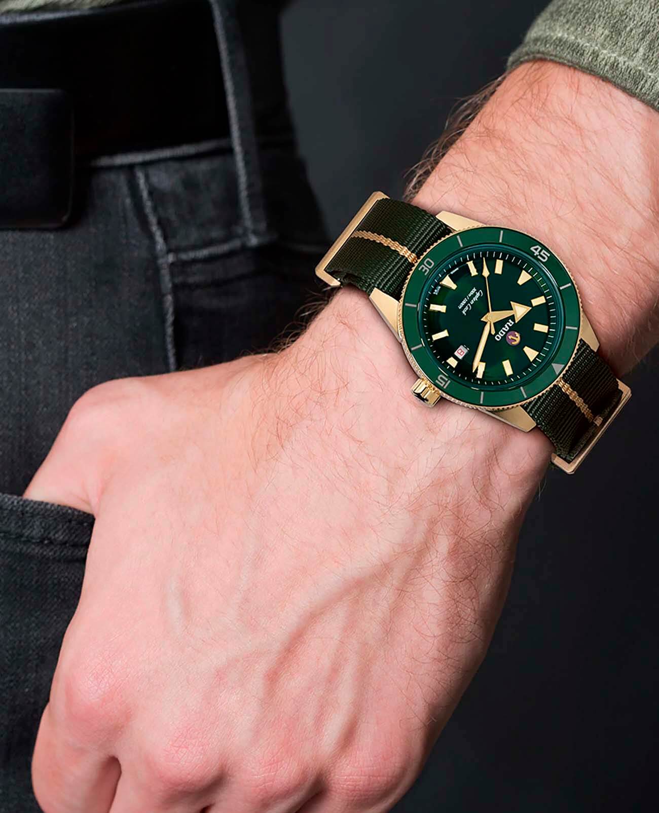 Швейцарские мужские механические часы Rado Captain Cook Automatic Bronze R32504317 из коллекции Captain Cook отражают традиции часового искусства 1960-х годов. Часы выполнены в классическом дизайне, модель останется актуальной на долгие годы. Лаконичный циферблат «солнечные лучи» дополнен контрастными цифрами. Премиальный аксессуар имеет роскошный корпус – он выполнен из бронзы и высокотехнологичной керамикиВысокотехнологичная керамикаИнновационный запатентованный Rado материал с гладкой или матовой поверхностью. Керамика за счёт кристаллической структуры обладает повышенной устойчивостью от возникновения царапин. Материал способен принимать температуру тела человека, обеспечивая невероятный комфорт при ношении.. Безупречную точность хода регулирует швейцарский автоматический калибр ETA C07.611 с запасом хода до 80 часов. Антибликовое покрытие сапфирового стекла улучшает читаемость показаний. Стрелки и метки дополнены люминесцентным покрытиемЛюминесцентное покрытиеПозволяет считывать показания времени в темноте. Производители наносят на стрелки, часовые индексы, безель или поверхность циферблата светонакопительный состав, дающий холодное свечение.. Закручивающаяся задняя крышка и завинчивающаяся заводная головка усиливают водостойкость модели до 30 бар. На метке 3 часов расположена апертура даты. Диаметр корпуса: 42 мм. Производство и сборка: Швейцария.
