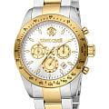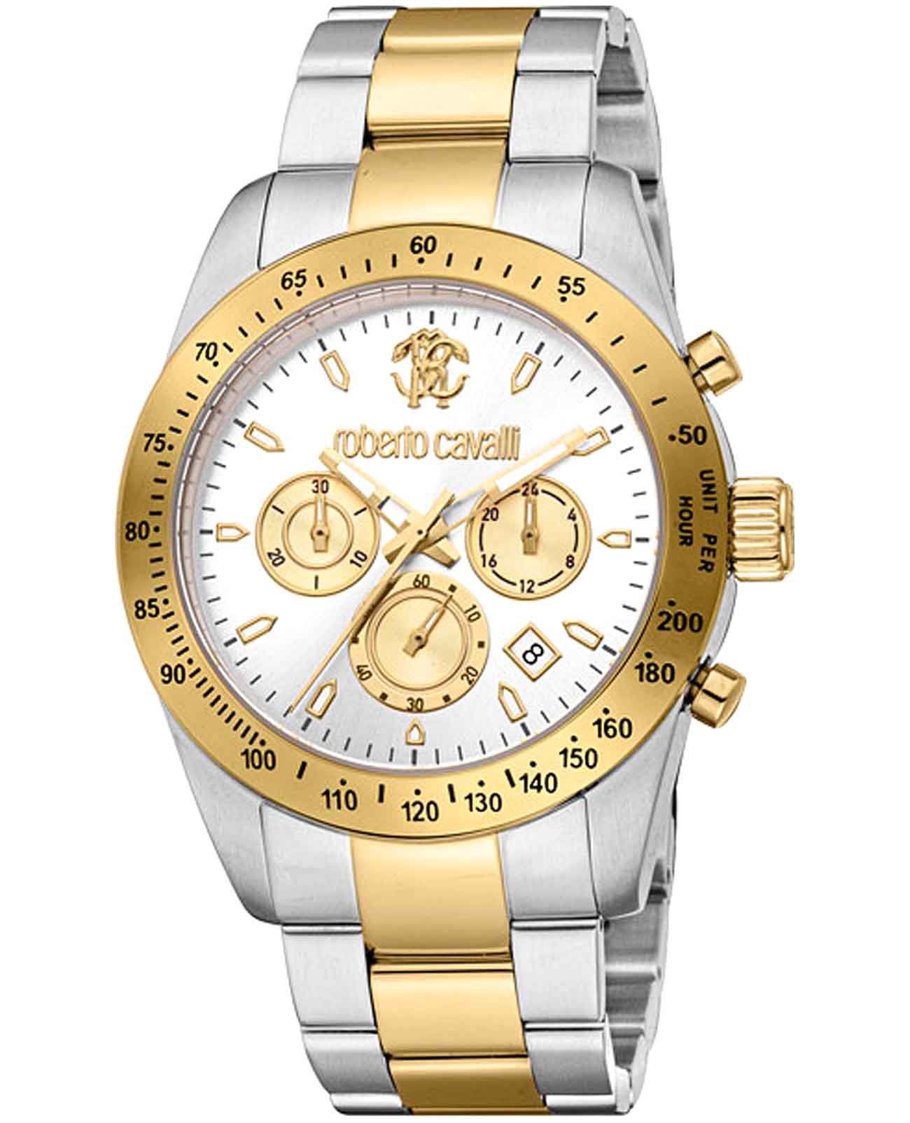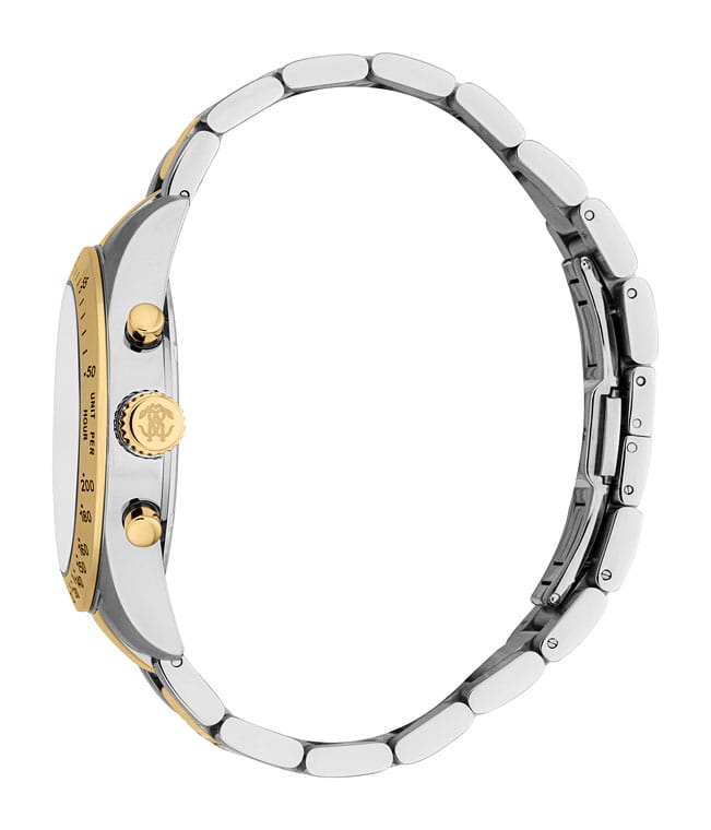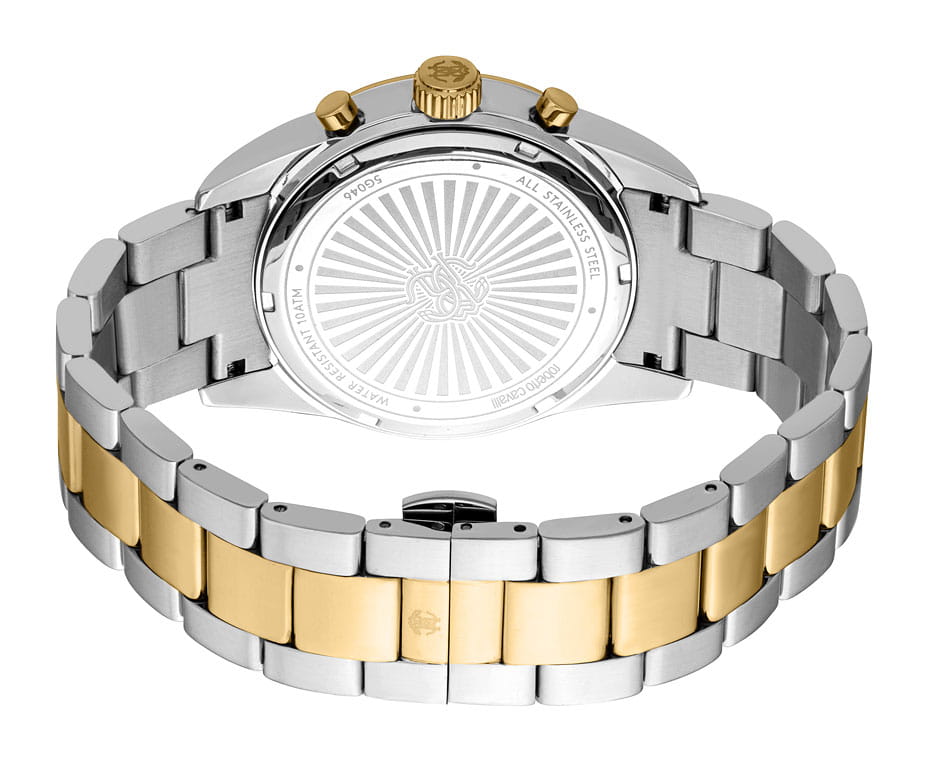 ROBERTO CAVALLI Uomo Chrono RC5G046M1075 — стильные итальянские часы с функцией хронографаХронографФункция позволяет измерять отрезки времени с особой точностью: часы, минуты, секунды. Верным признаком хронографа является наличие на циферблате 3 дополнительных окошек-счётчиков., которые сочетают в себе элегантность и современный функционал. Круглый корпус диаметром 42 мм выполнен из нержавеющей стали, толщина корпуса составляет 12 мм, что придает модели выразительный внешний вид и надежную защиту от внешних воздействий. Часы оснащены кварцевым механизмом, также обладают функцией отображения даты, что делает их удобными для ежедневного использования. Минеральное стеклоМинеральное стеклоМинеральное стекло представляет собой искусственно выращенный минерал кварца. Такое стекло отличается особой устойчивостью к повреждениям и царапинам. Уступает по некоторым качествам сапфировому стеклу. защищает часы от царапин. Водозащита 100 метров, позволит плавать, нырять и заниматься другими водными видами спорта. Неподвижный безельБезельВнешний ободок, закрепляющий стекло. В спортивных часах так называется поворотное кольцо с делениями на циферблате, выполняет роль таймера – замеряет отрезки времени на шкале. Неподвижный безель – элемент декора. Однонаправленно вращающийся безель на дайверских часах позволяет фиксировать моменты погружения и выныривания на поверхность. с PVD-покрытиемPVDУльтратонкое покрытие наносится в технике вакуумного напыления, сочетает в себе нитрид титана особой прочности со слоем золота или оксида хрома. Несёт в себе декоративную или защитную функцию.. Стальной браслет с частичным PVD-покрытиемPVDУльтратонкое покрытие наносится в технике вакуумного напыления, сочетает в себе нитрид титана особой прочности со слоем золота или оксида хрома. Несёт в себе декоративную или защитную функцию. на застёжке-бабочке с кнопкамиЗастёжка "бабочка"Такой вид застёжки дополняется предохранителями, помогающими избежать случайного раскрытия браслета. Обладают изящным исполнением. обеспечивает комфортное ношение. Стрелки с люминесцентным покрытиемЛюминесцентное покрытиеПозволяет считывать показания времени в темноте. Производители наносят на стрелки, часовые индексы, безель или поверхность циферблата светонакопительный состав, дающий холодное свечение. обеспечивают отличную читаемость в любое время суток.