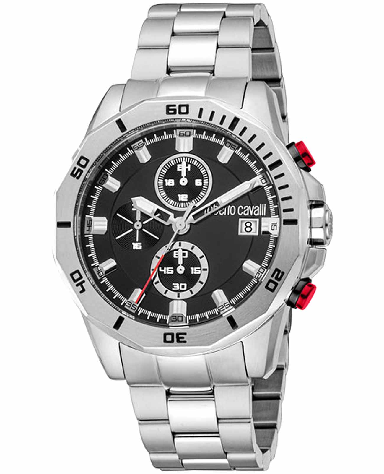 ROBERTO CAVALLI Uomo Sport III RC5G109M0065 — стильные итальянские часы-хронографХронографФункция позволяет измерять отрезки времени с особой точностью: часы, минуты, секунды. Верным признаком хронографа является наличие на циферблате 3 дополнительных окошек-счётчиков. сочетающие в себе элегантность и современный функционал. Корпус диаметром 42 мм выполнен из нержавеющей стали, толщина корпуса составляет 9 мм, что придает модели выразительный внешний вид и надежную защиту от внешних воздействий. Циферблат, искусно оформленный фирменными элементами Roberto Cavalli, притягивает взгляд и подчеркивает ваш безупречный вкус. Часы оснащены кварцевым механизмом, также обладают функцией отображения даты, что делает их удобными для ежедневного использования. Минеральное стеклоМинеральное стеклоМинеральное стекло представляет собой искусственно выращенный минерал кварца. Такое стекло отличается особой устойчивостью к повреждениям и царапинам. Уступает по некоторым качествам сапфировому стеклу. защищает часы от царапин. Водозащита 100 метров позволит плавать, нырять и заниматься другими водными видами спорта. Стальной браслет на застёжке-бабочке с кнопкамиЗастёжка "бабочка"Такой вид застёжки дополняется предохранителями, помогающими избежать случайного раскрытия браслета. Обладают изящным исполнением. обеспечивает комфортное ношение. Стрелки и метки с люминесцентным покрытиемЛюминесцентное покрытиеПозволяет считывать показания времени в темноте. Производители наносят на стрелки, часовые индексы, безель или поверхность циферблата светонакопительный состав, дающий холодное свечение. обеспечивают отличную читаемость в любое время суток.