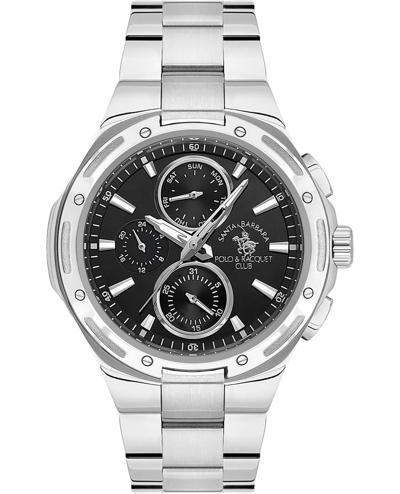 Мужские кварцевые часы Santa Barbara Polo & Racquet Club — это эффектный и функциональный аксессуар. Корпус диаметром 44 мм выполнен из стали с матовой и полированной отделкой. Циферблат чёрного цвета оформлен по технологии Sunray («солнечные лучи»), дополнен накладными метками в виде штрихов и фирменным логотипом. Указатели дня недели и даты вынесены на отдельные субциферблаты, также присутствует индикация 24-часового формата времени. Стрелки заострённые, прямоугольные, в стиле Baton, с люминесцентным покрытиемЛюминесцентное покрытиеПозволяет считывать показания времени в темноте. Производители наносят на стрелки, часовые индексы, безель или поверхность циферблата светонакопительный состав, дающий холодное свечение., обеспечивающим хорошую читаемость в темноте. Метки также имеют люминесцентное покрытие. Циферблат защищён минеральным стекломМинеральное стеклоМинеральное стекло представляет собой искусственно выращенный минерал кварца. Такое стекло отличается особой устойчивостью к повреждениям и царапинам. Уступает по некоторым качествам сапфировому стеклу.. Часы оснащены стальным браслетом с раскладной застёжкойРаскладная застёжкаТакой тип застёжки используется только на браслетах из металла. Она никогда не раскрывается полностью, происходит разделение на 2 и более частей. Раскладывающая застёжка снизит вероятность потери часов к минимуму.. Водонепроницаемость 50 м позволяет использовать часы в повседневных условиях. Идеальный выбор для тех, кто ценит стиль, точность и надёжность.