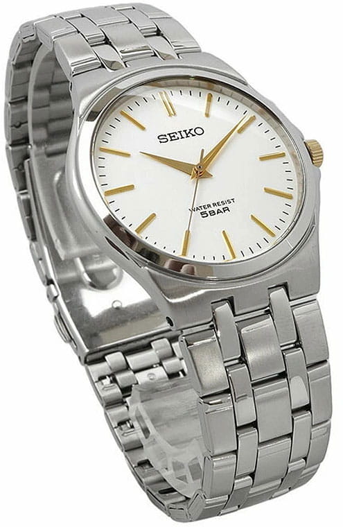 Мужские кварцевые часы Seiko — это надёжный и универсальный аксессуар. Корпус диаметром 34 мм выполнен из нержавеющей стали 316L. Циферблат оформлен индексами и стрелками, включая центральную секундную стрелку. Циферблат защищён прочным закалённым минеральным стеклом Hardlex минеральным стекломМинеральное стеклоМинеральное стекло представляет собой искусственно выращенный минерал кварца. Такое стекло отличается особой устойчивостью к повреждениям и царапинам. Уступает по некоторым качествам сапфировому стеклу.. Механизм — калибр 7N01 с высокой точностью хода (±10–15 сек. в месяц). Часы оснащены стальным браслетом на тройной раскладной застёжкеРаскладная застёжкаТакой тип застёжки используется только на браслетах из металла. Она никогда не раскрывается полностью, происходит разделение на 2 и более частей. Раскладывающая застёжка снизит вероятность потери часов к минимуму. с фиксатором. Водонепроницаемость 50 м позволяет использовать часы в повседневных условиях. Идеальный выбор для тех, кто ценит японское качество и классический дизайн.