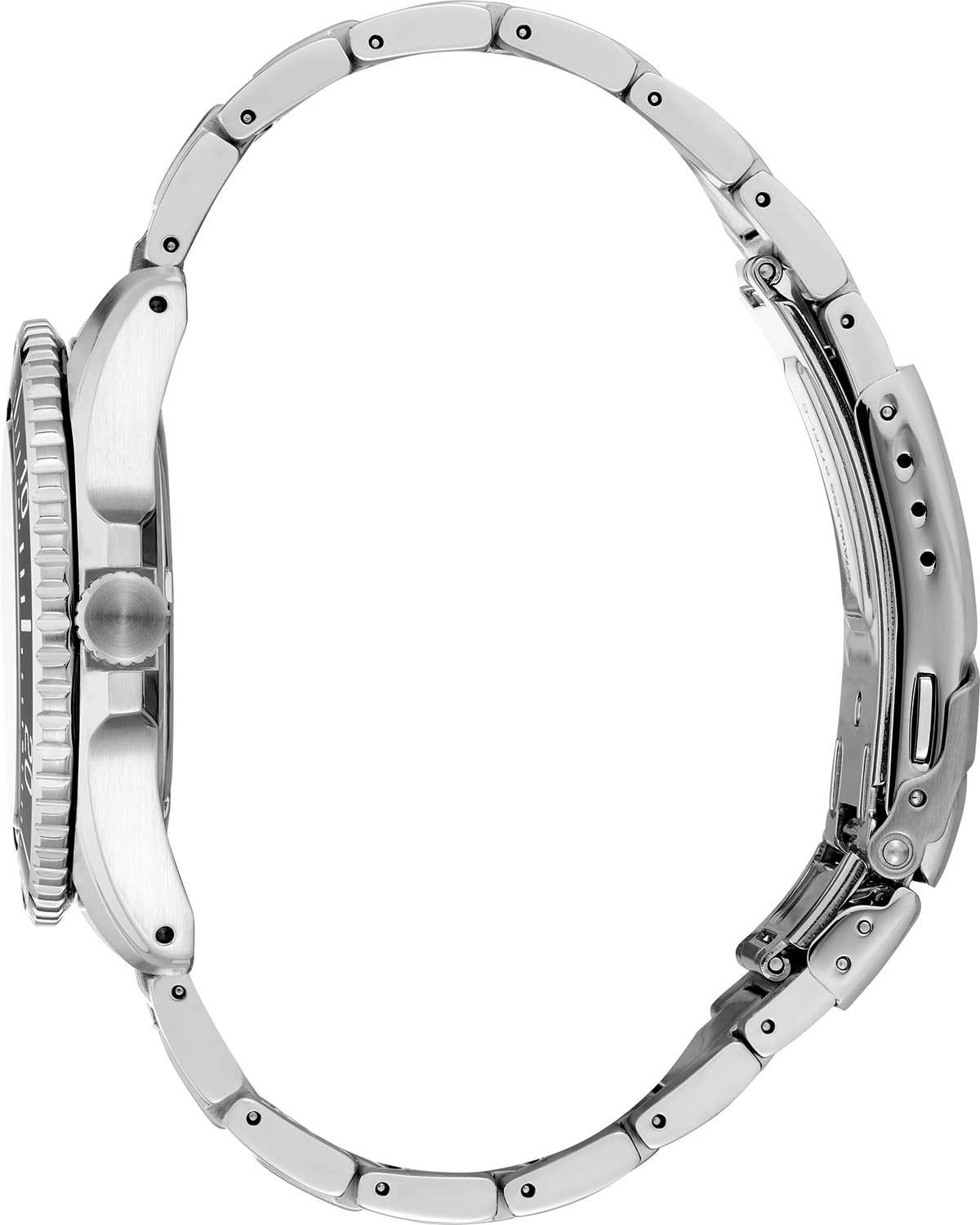 Мужские наручные часы Seiko Prospex SNE589 из коллекции Prospex сочетают в себе спортивный дизайн и надежность современных технологий. Модель обладает круглым корпусом диаметром 42,8 мм, изготовленным из нержавеющей стали, что обеспечивает высокую устойчивость к внешним воздействиям . Защита циферблата выполнена с использованием сапфирового стеклаСапфировое стеклоПрочный и надёжный материал из кристалла сапфира синтетического происхождения, характеризующийся особой твёрдостью и устойчивостью к царапинам и повреждениям., устойчивого к появлению царапин и обладающего высокой прозрачностью . БезельБезельВнешний ободок, закрепляющий стекло. В спортивных часах так называется поворотное кольцо с делениями на циферблате, выполняет роль таймера – замеряет отрезки времени на шкале. Неподвижный безель – элемент декора. Однонаправленно вращающийся безель на дайверских часах позволяет фиксировать моменты погружения и выныривания на поверхность. с PVD-покрытиемPVDУльтратонкое покрытие наносится в технике вакуумного напыления, сочетает в себе нитрид титана особой прочности со слоем золота или оксида хрома. Несёт в себе декоративную или защитную функцию.. Часы оснащены системой Solar, которая не требует замены батарейки и обеспечивает запас хода до 10 месяцев при полной зарядке аккумулятора . Кварцевый механизм с калибром V157 гарантирует высокую точность работы, а функция EOLEOLПредставляет собой систему, уведомляющую владельца часов о необходимости замены элемента питания. За 2 недели до полного разряда батарейки секундная стрелка перестаёт ходить чётко и начинает перепрыгивать на 3-4 деления. позволяет контролировать уровень заряда аккумулятора . Циферблат дополнен люминесцентным покрытиемЛюминесцентное покрытиеПозволяет считывать показания времени в темноте. Производители наносят на стрелки, часовые индексы, безель или поверхность циферблата светонакопительный состав, дающий холодное свечение., обеспечивающим видимость в темное время суток. Водонепроницаемость модели достигает 200 метров (WR200), что делает ее подходящей для плавания, ныряния и других водных видов спорта, включая погружение с аквалангом. Браслет выполнен из нержавеющей стали на раскладной застёжкеРаскладная застёжкаТакой тип застёжки используется только на браслетах из металла. Она никогда не раскрывается полностью, происходит разделение на 2 и более частей. Раскладывающая застёжка снизит вероятность потери часов к минимуму., что обеспечивает комфортное ношение и долговечность.
