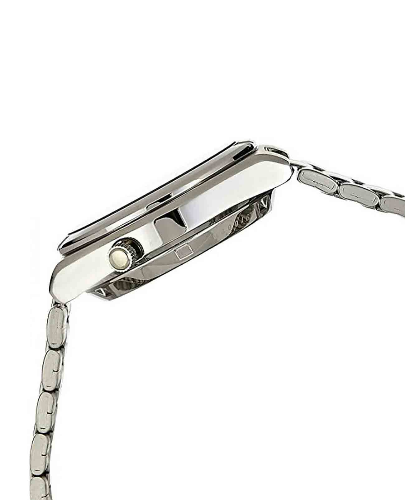 Браслет, оборудованный раскладной застёжкойРаскладная застёжкаТакой тип застёжки используется только на браслетах из металла. Она никогда не раскрывается полностью, происходит разделение на 2 и более частей. Раскладывающая застёжка снизит вероятность потери часов к минимуму. с кнопками, обеспечивает удобную и безопасную фиксацию на запястье, что делает повседневную носку еще более комфортной. Узнать текущую дату и день недели можно благодаря окошку, расположенному в удобном положении 3 часа, что делает эти часы практичными и функциональными.