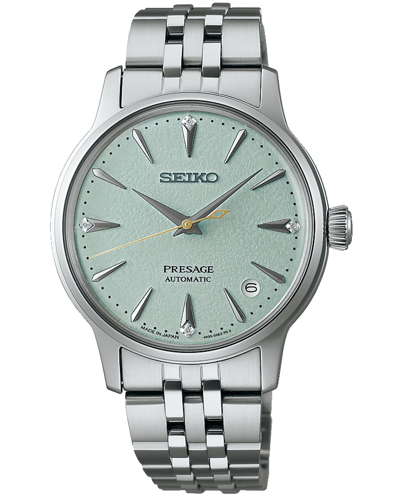 Модель Seiko Presage Cocktail Time SRPL63 вдохновлена свежестью японского коктейля Frozen Sky Diving. Часы отличаются циферблатом с четырьмя метками из драгоценных камней, что придаёт им особую роскошь и изысканность. Корпус диаметром 40 мм изготовлен из нержавеющей стали, а стекло выполнено по технологии Hardlex — это минеральное стеклоМинеральное стеклоМинеральное стекло представляет собой искусственно выращенный минерал кварца. Такое стекло отличается особой устойчивостью к повреждениям и царапинам. Уступает по некоторым качествам сапфировому стеклу. повышенной прочности, устойчивое к мелким механическим повреждениям. Механизм — автоматический калибр 4R35, обеспечивающий надёжную работу часов и запас хода до 41 часа. Функция отображения даты добавляет модели практичности. Часы водонепроницаемы до 5 атмосфер, что соответствует защите от случайных капель дождя. Браслет и застёжка выполнены из стали, оснащены раскладной застёжкойРаскладная застёжкаТакой тип застёжки используется только на браслетах из металла. Она никогда не раскрывается полностью, происходит разделение на 2 и более частей. Раскладывающая застёжка снизит вероятность потери часов к минимуму., обеспечивающей удобство ношения. Дизайн часов дополнен классическим сочетанием материалов и цветов, что делает их универсальным аксессуаром для повседневного и торжественного образа. Модель 2025 года имеет современный, лаконичный внешний вид, сохраняя при этом традиционные элементы часового мастерства Seiko.