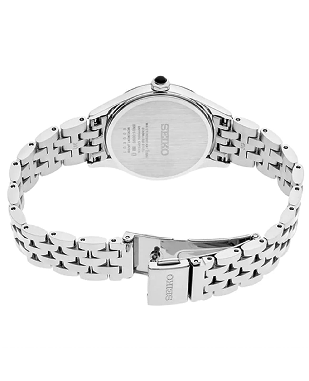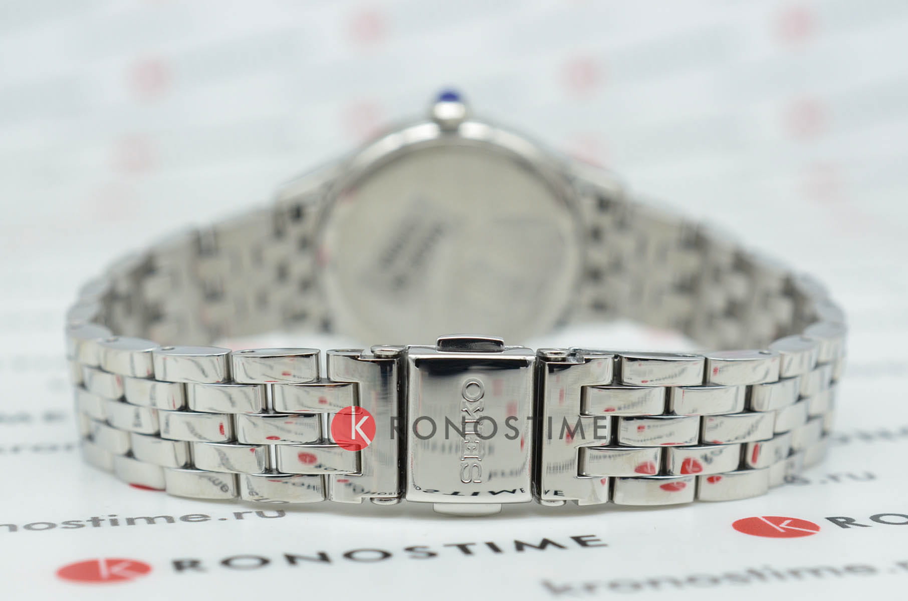 Женские кварцевые часы Seiko — это изысканный аксессуар, сочетающий элегантный дизайн и надёжную функциональность. Корпус диаметром 29,6 мм и толщиной 6,2 мм выполнен из нержавеющей стали. Циферблат серебристого цвета оформлен римскими цифрами. Циферблат защищён сапфировым стекломСапфировое стеклоПрочный и надёжный материал из кристалла сапфира синтетического происхождения, характеризующийся особой твёрдостью и устойчивостью к царапинам и повреждениям.. Часы оснащены стальным браслетом с раскладной застёжкойРаскладная застёжкаТакой тип застёжки используется только на браслетах из металла. Она никогда не раскрывается полностью, происходит разделение на 2 и более частей. Раскладывающая застёжка снизит вероятность потери часов к минимуму.. Водонепроницаемость 50 м позволяет использовать часы в повседневных условиях. Идеальный выбор для тех, кто ценит стиль, качество и безупречный внешний вид.
