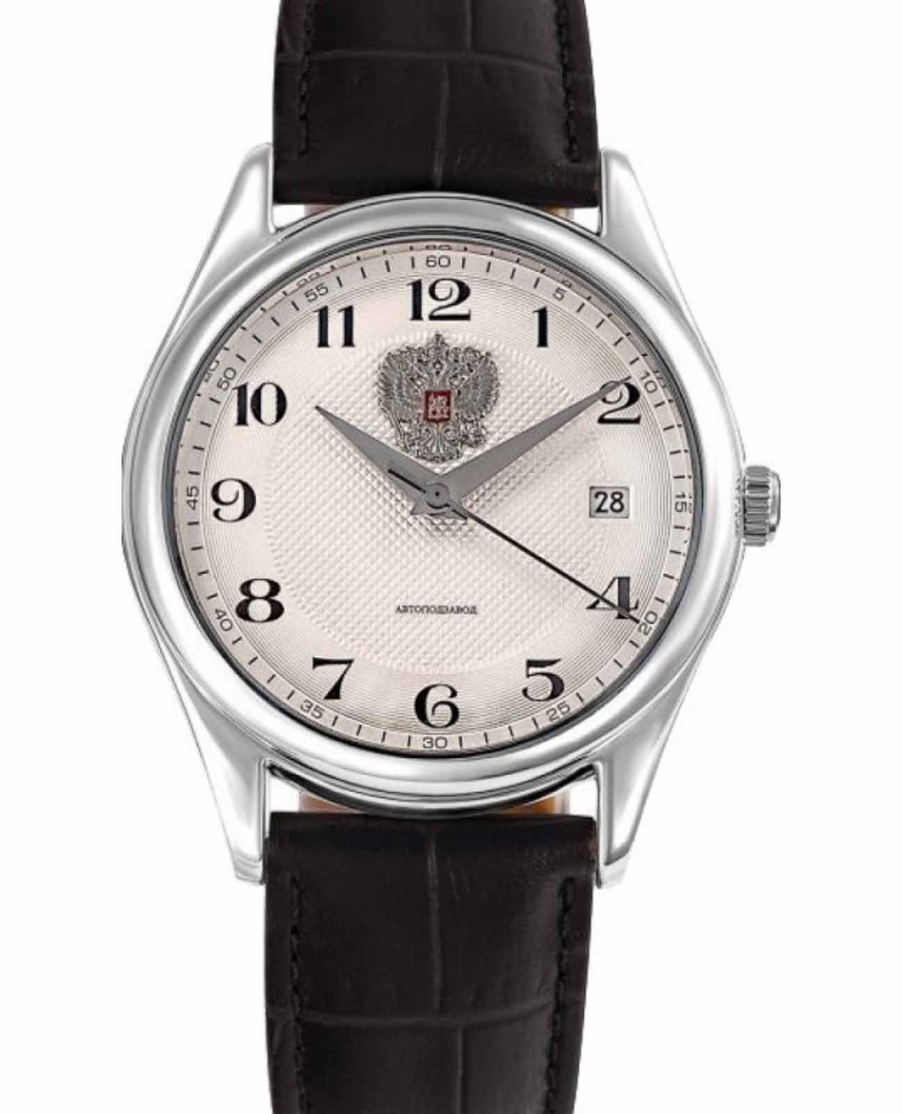 Российские механические наручные часы Слава Сенат 1490864/300-8215, которые станут идеальным аксессуаром для повседневного ношения. Эти часы сочетают в себе элегантность и практичность, предлагая безупречный стиль и надежность. Оснащенные механизмом Miyota 8215 с автоподзаводом, они обеспечивают точность и долговечность. Стальной корпус с сапфировым стекломСапфировое стеклоПрочный и надёжный материал из кристалла сапфира синтетического происхождения, характеризующийся особой твёрдостью и устойчивостью к царапинам и повреждениям. защищает белый циферблат с арабскими цифрами. На циферблате изображены герб Российской Федерации. Часы также имеют календарь с окошком даты на 3 часах и водозащиту до 50WR, что делает их надежными в различных условиях. Текстурированный кожаный черный ремешок с классической застежкой завершает этот изысканный образ.