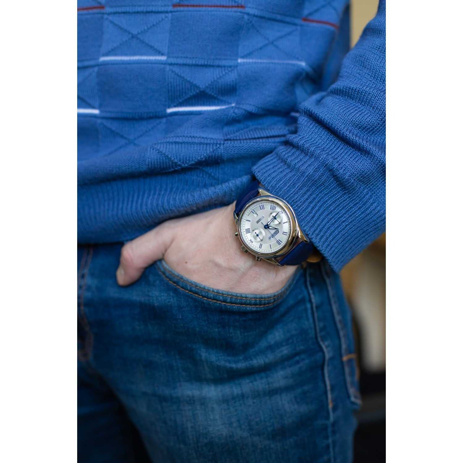 Российские механические наручные часы-хронографХронографФункция позволяет измерять отрезки времени с особой точностью: часы, минуты, секунды. Верным признаком хронографа является наличие на циферблате 3 дополнительных окошек-счётчиков. с секундомеромСекундомерСекундоме́р — прибор, способный измерять интервалы времени с точностью до долей секунды. Слава Сенат 1880139/300-4617, которые станут идеальным аксессуаром для повседневного ношения. Эти часы сочетают в себе элегантность и практичность, предлагая безупречный стиль и надежность. Оснащенные механизмом Peacock 4617 с автоподзаводом, они обеспечивают точность и долговечность. Стальной корпус с сапфировым стекломСапфировое стеклоПрочный и надёжный материал из кристалла сапфира синтетического происхождения, характеризующийся особой твёрдостью и устойчивостью к царапинам и повреждениям. защищает белый циферблат с римскими цифрами. Часы также имеют календарь с окошком даты на 6 часах и водозащиту до 50WR, что делает их надежными в различных условиях. Стрелки часов с люминесцентным покрытиемЛюминесцентное покрытиеПозволяет считывать показания времени в темноте. Производители наносят на стрелки, часовые индексы, безель или поверхность циферблата светонакопительный состав, дающий холодное свечение., что облегчает чтение времени даже в условиях слабого освещения. Текстурированный кожаный синий ремешок с классической застежкой завершает этот изысканный образ.